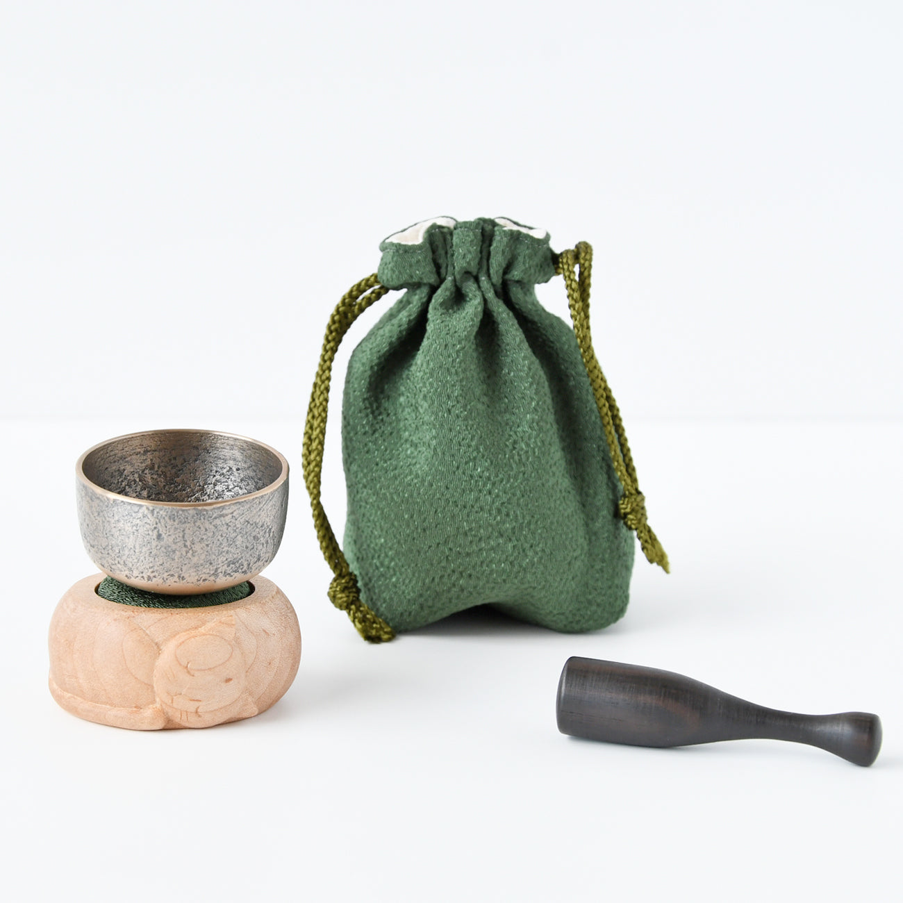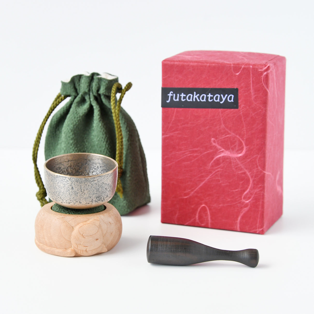 二方屋製の ’CORIN プチ’ は、ちょこんと掌にのります。小さなようでもありますが、砂張(さはり)という金属で作られていますので、しっかりした音色を奏でます。