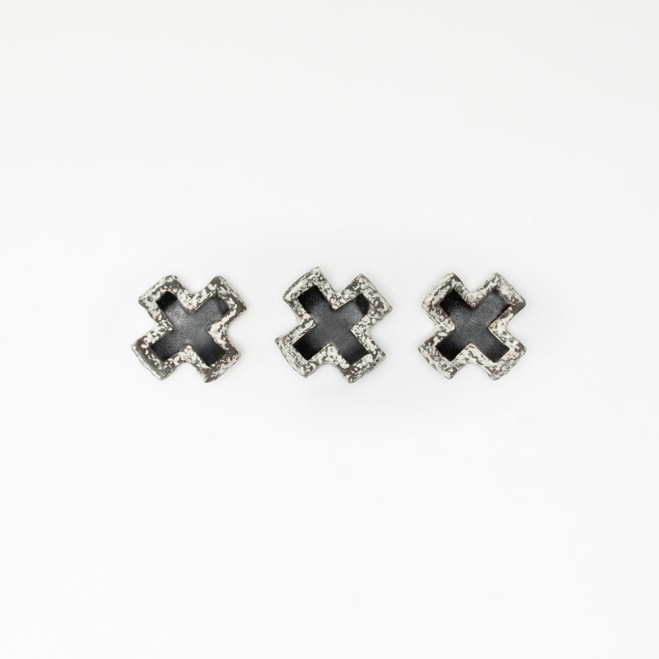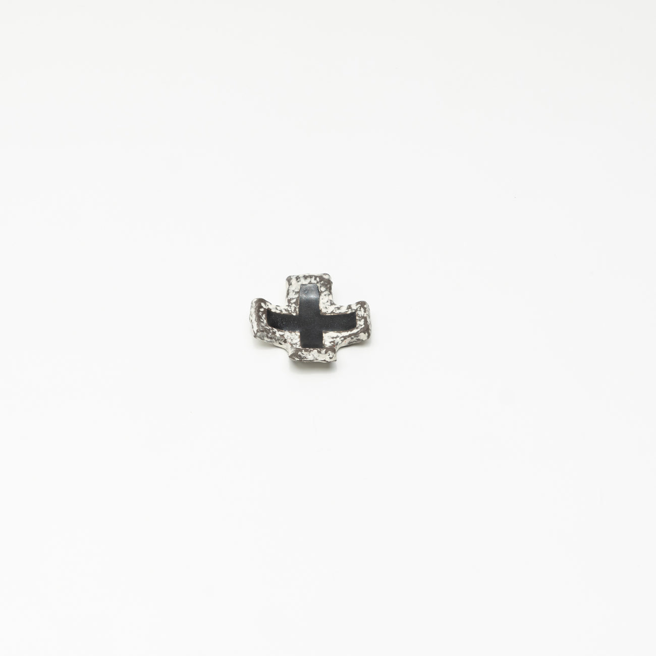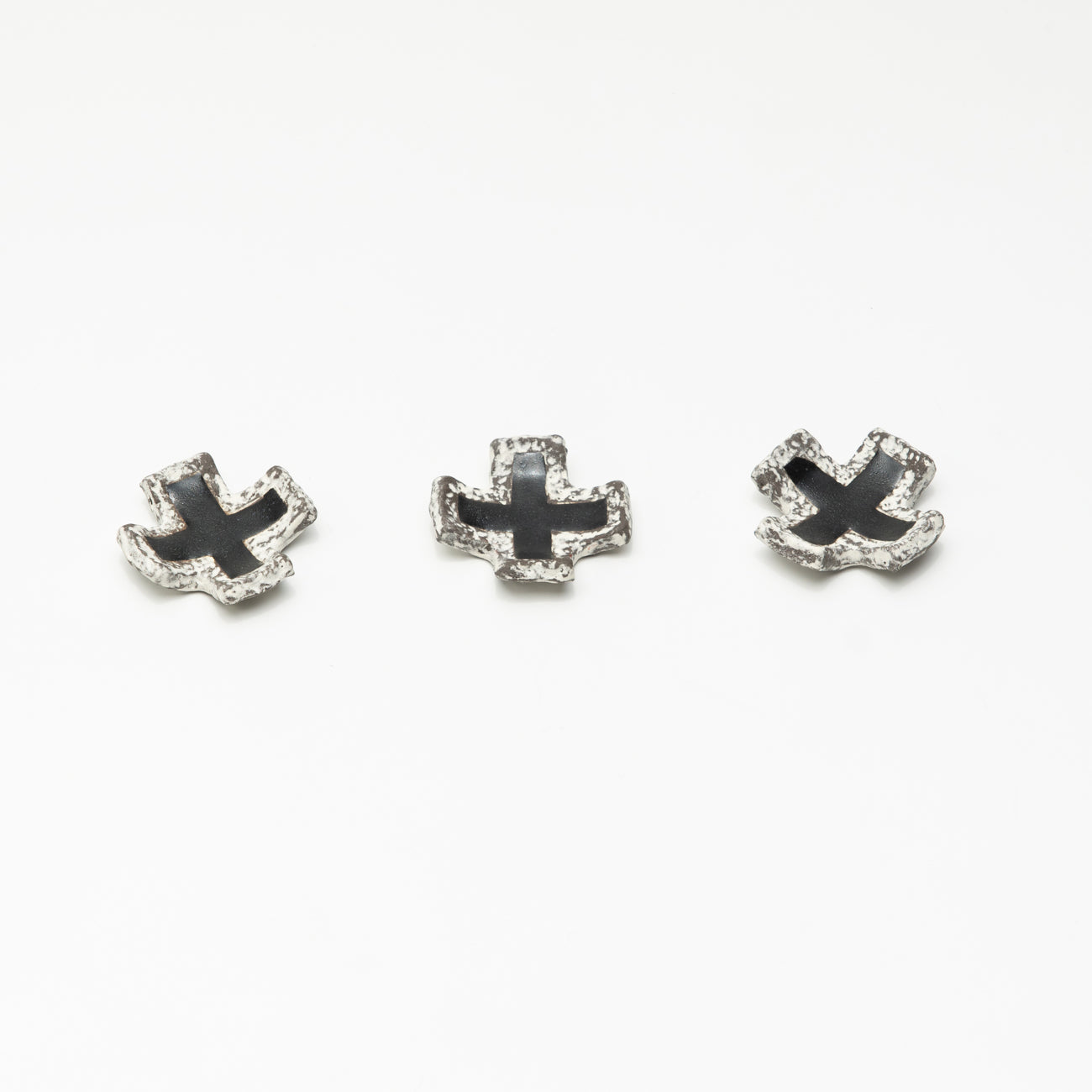黒伊賀土を岩肌のテクスチャーに白化粧を埋めて素地を作り、クロス形に仕上げられています。中央には黒釉がかかっており、デザインが引き締まっています。