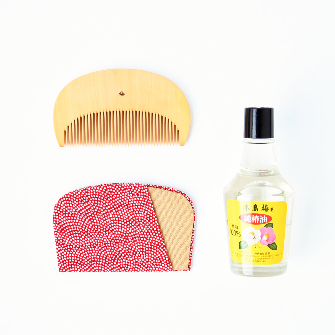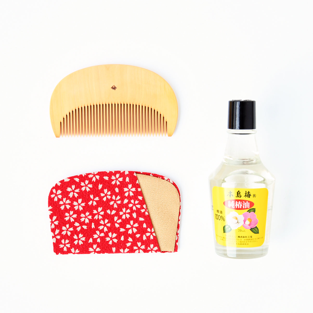 かわいい半月形をしたつげ材の花ぐしと専用のケース、櫛のお手入れ用の椿油のセット。