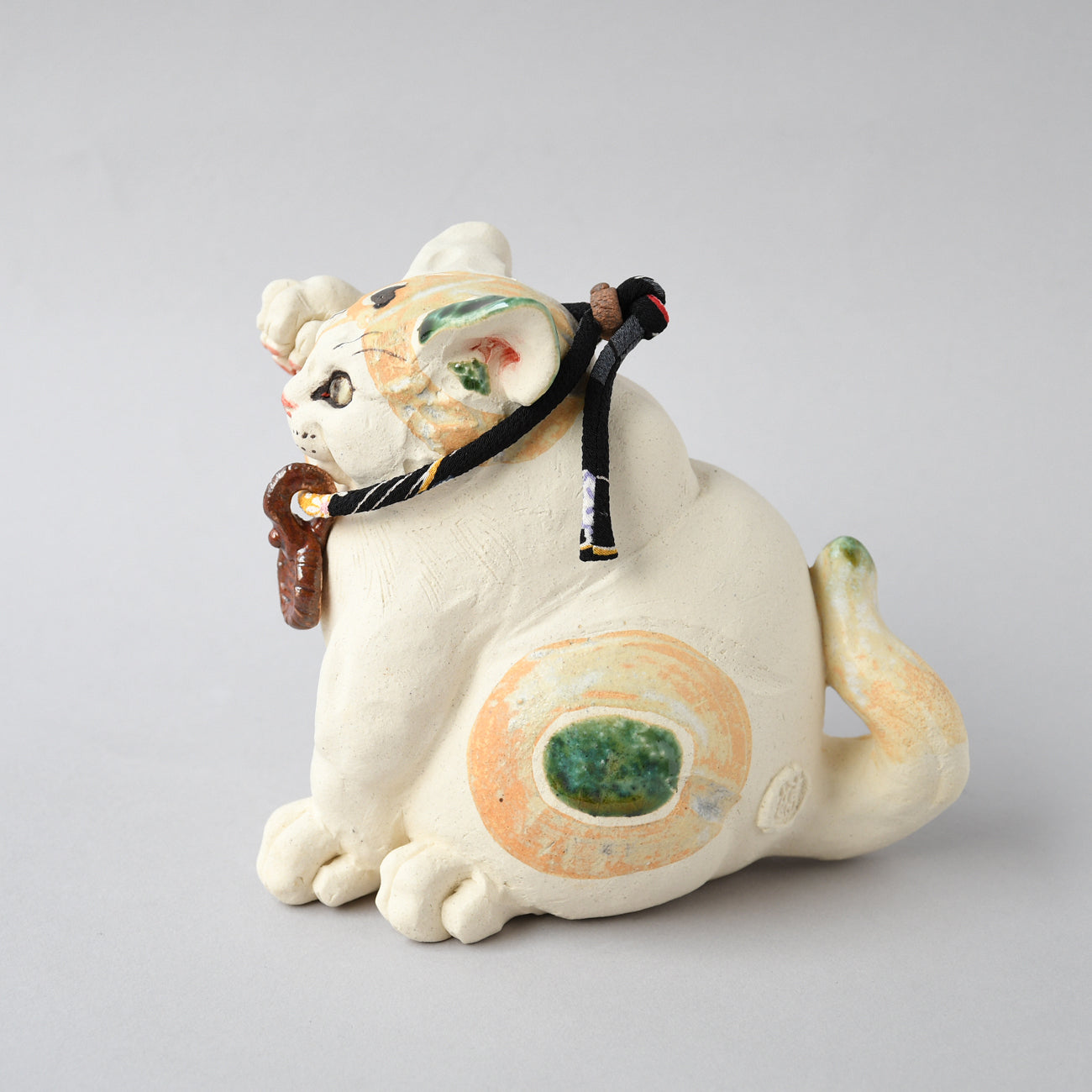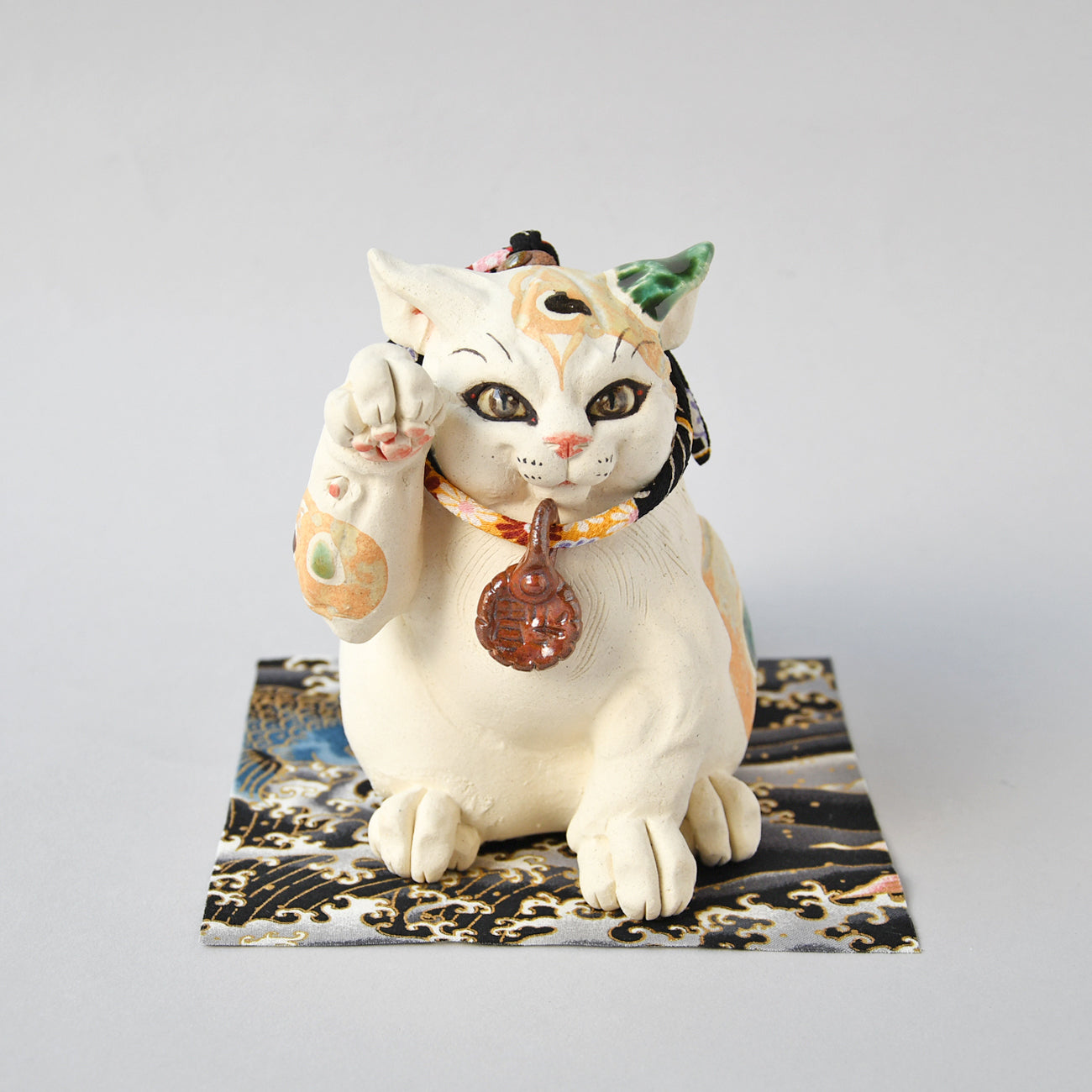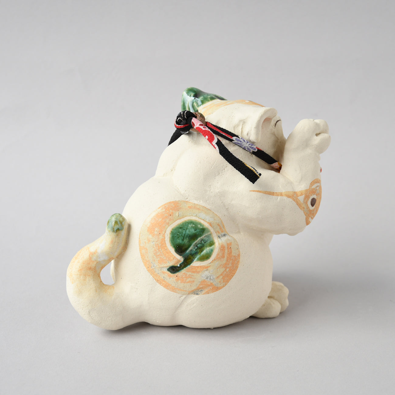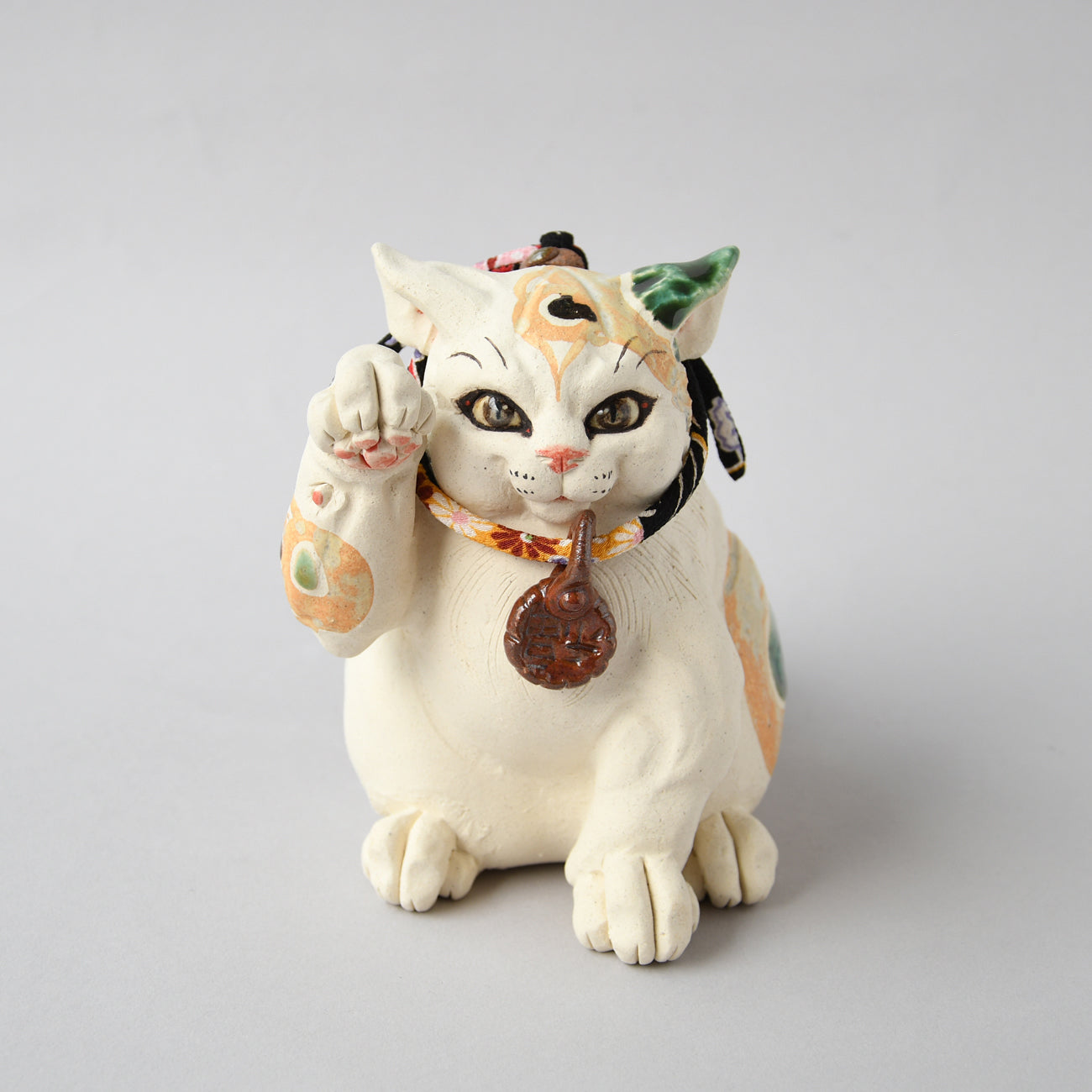 ぽっちゃりした肉付きはふてぶてしさも感じる布袋招き猫。そしてしっかりと福を招いてくれるようにと、力強い腕。金運を招く右手招き猫は鋭い昼の目をしています。