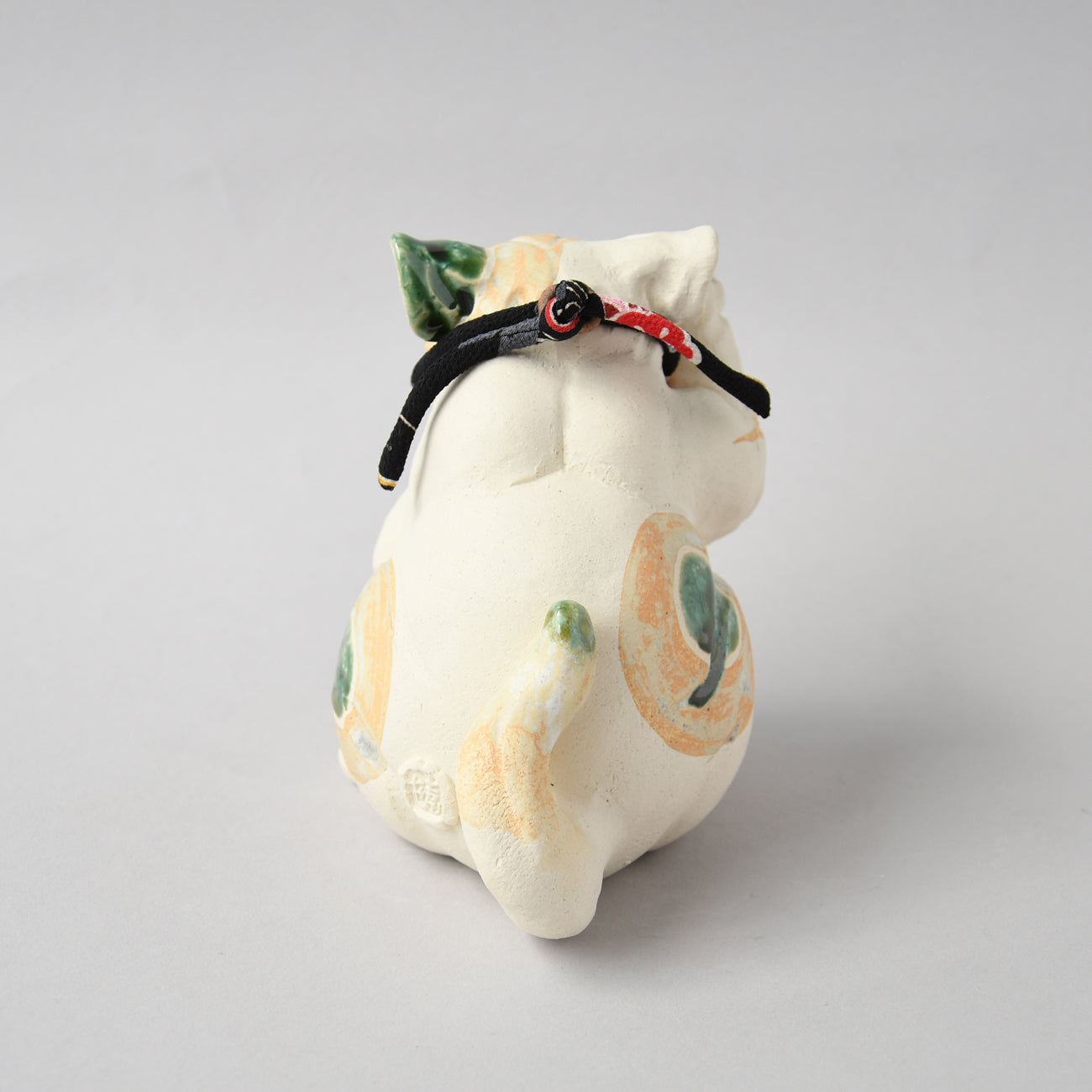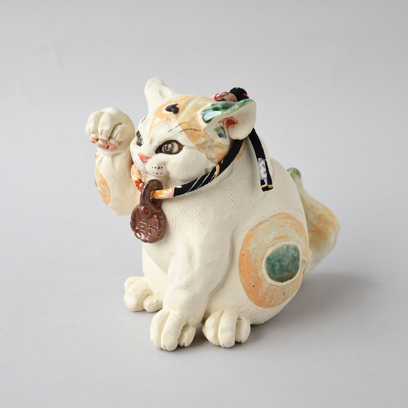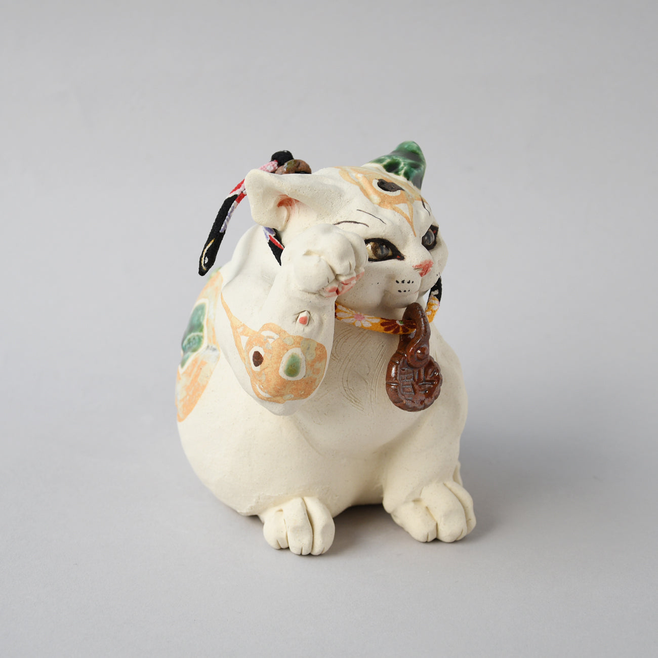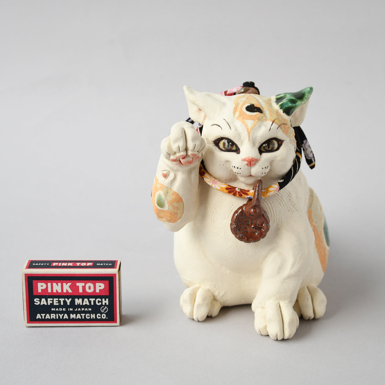 ぽっちゃりした肉付きはふてぶてしさも感じる布袋招き猫。そしてしっかりと福を招いてくれるようにと、力強い腕。金運を招く右手招き猫は鋭い昼の目をしています。