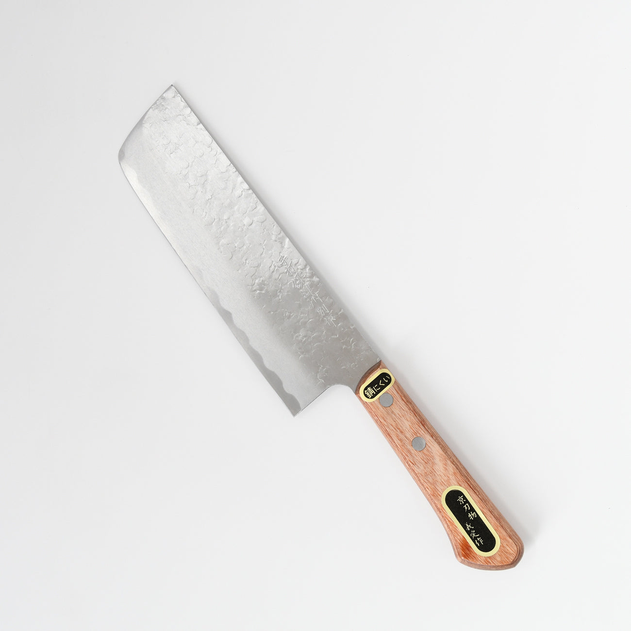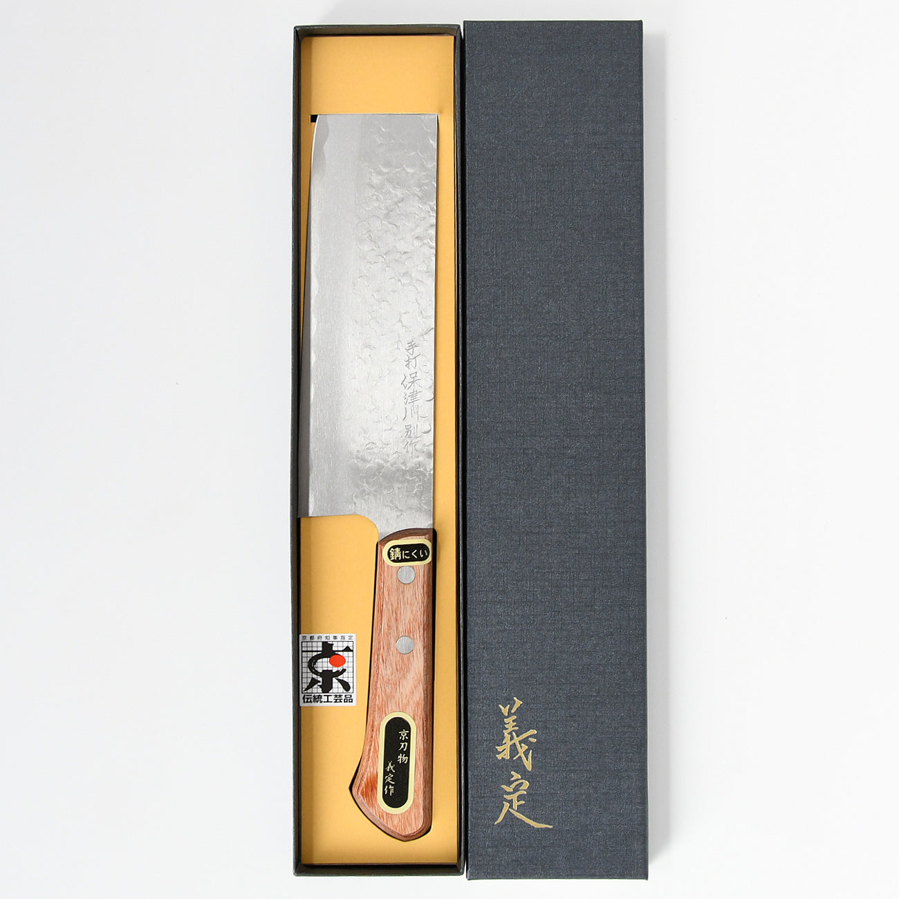 義定が造る鍛造包丁は、金属を加熱し、金槌で叩いて圧力を加え、内部の空隙(くうげき)をつぶし、結晶を微細にすることで、強度を高められて出来た包丁です。