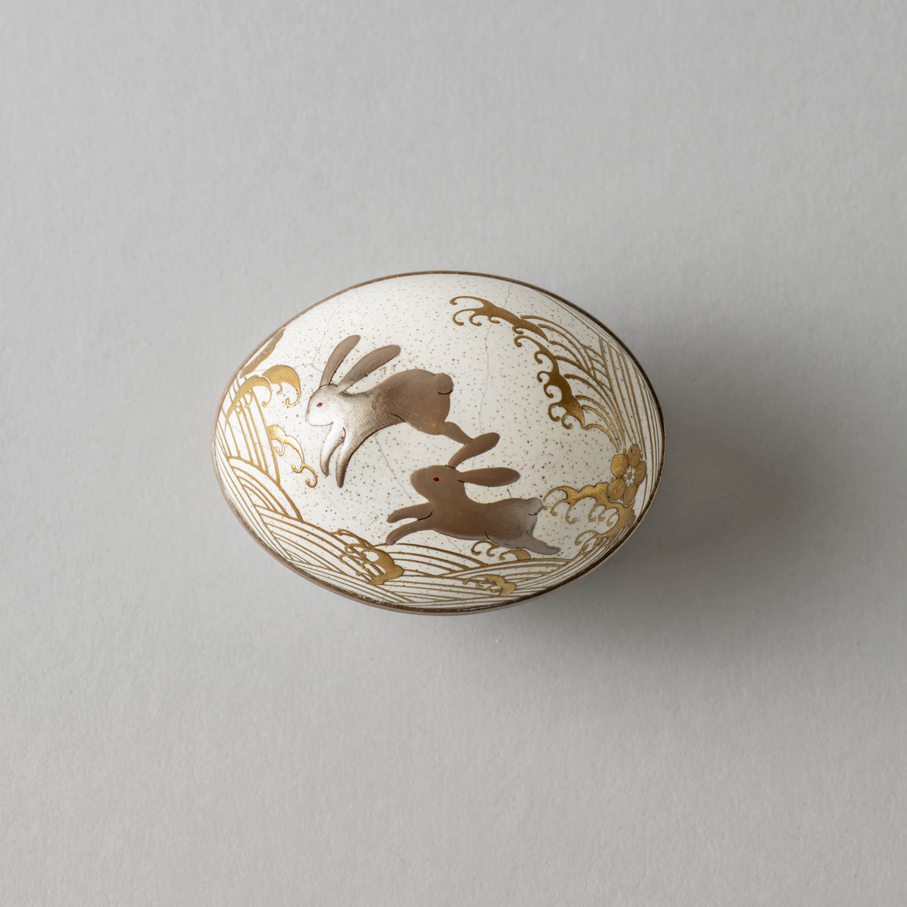 兎は一度に多くの子供を産むことから、日本では、繁栄、生命力、幸運、飛躍、縁結び、といった意味合いがあり、兎をモチーフに描かれたものは、縁起が良いものとされ、好まれます。