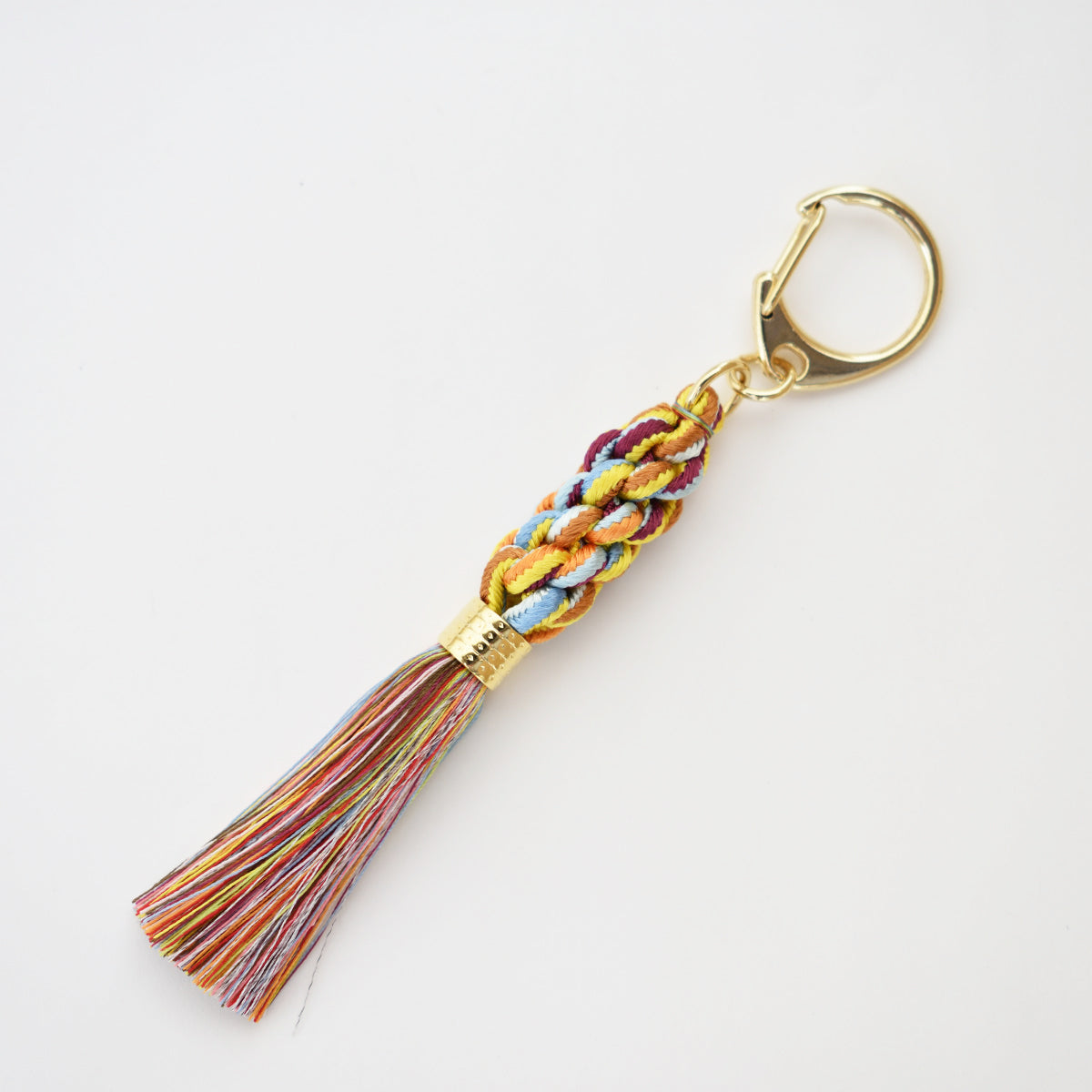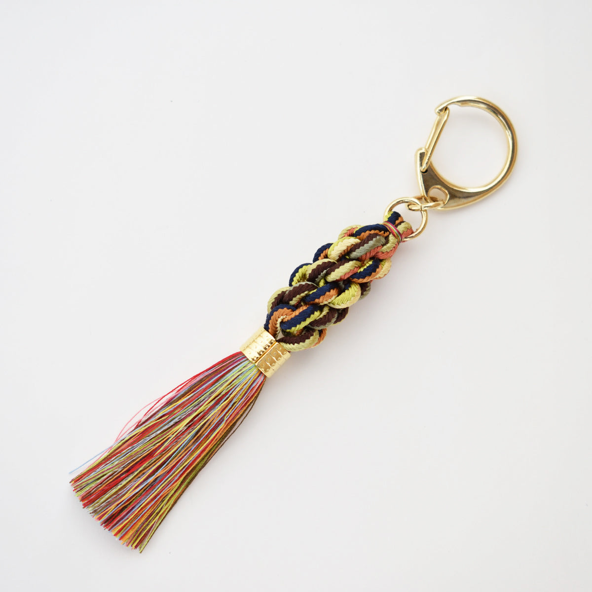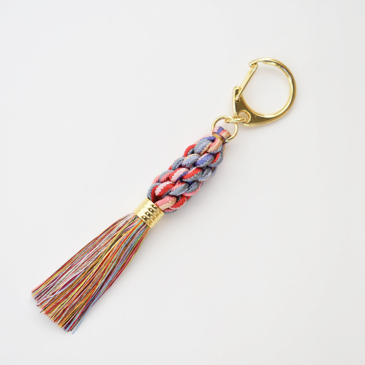 2本の組紐を「四つだたみ」という結びで丸みのある独特のフォルムに仕上げました。絹ならではの美しさを纏った色鮮やかなチャームは、付けるだけで華やかな雰囲気になります。鍵やバッグなど身近な物に付けてお楽しみいただけます。また静電気を逃がす特殊な糸を房に混ぜ込んでおり、房を握ることで静電気の発生を抑えることができます。