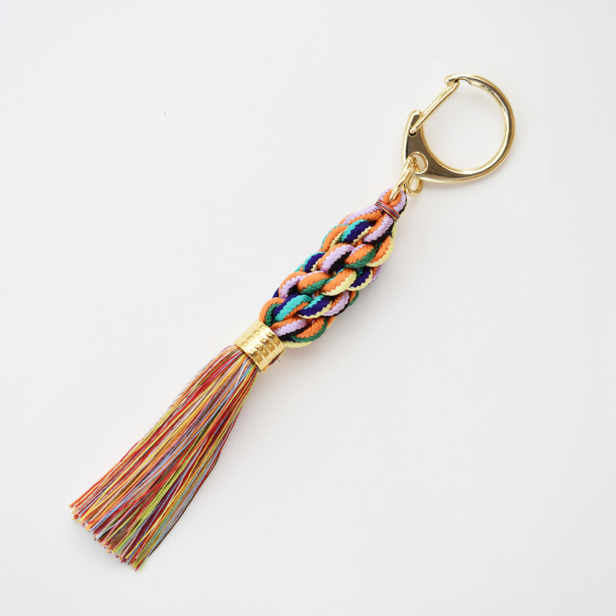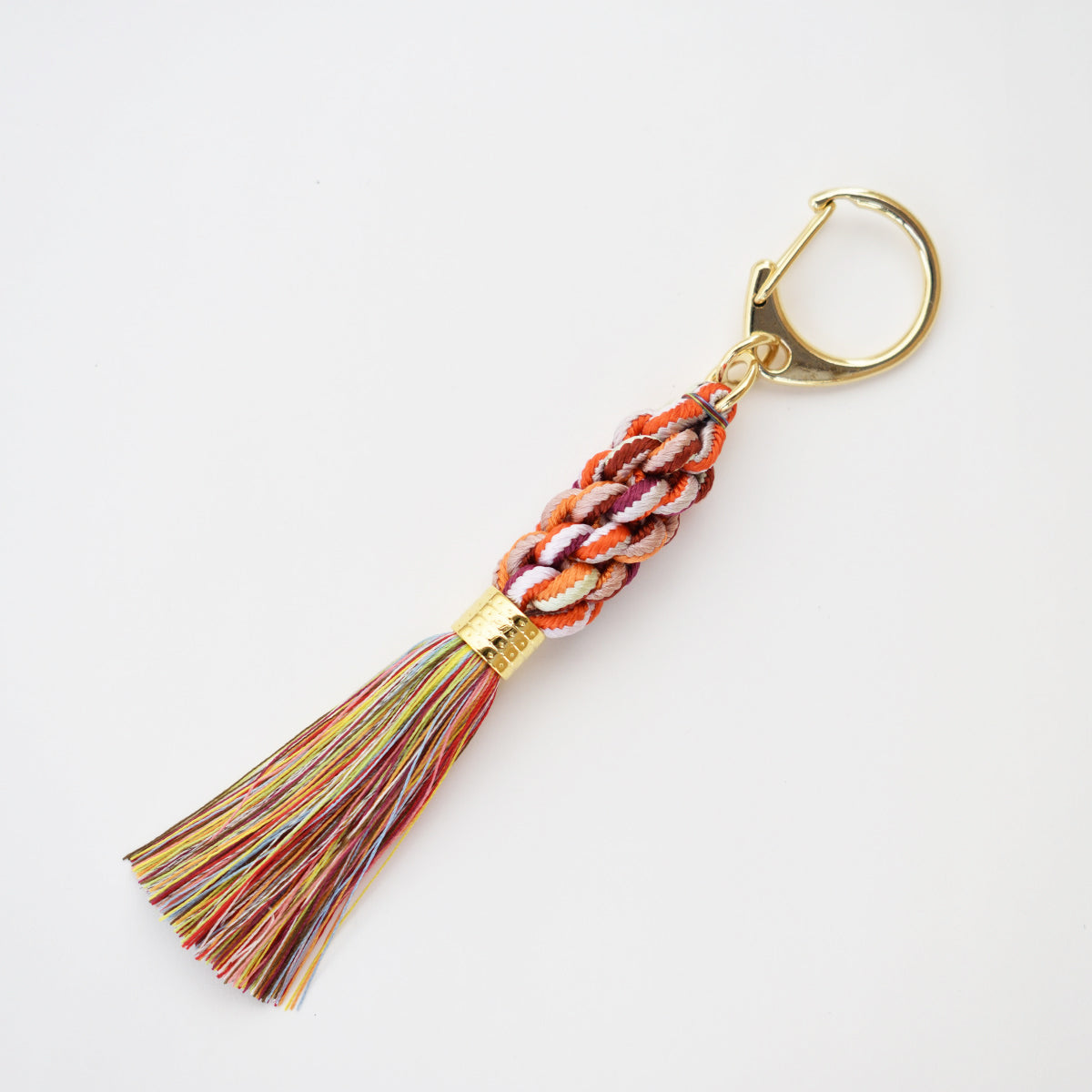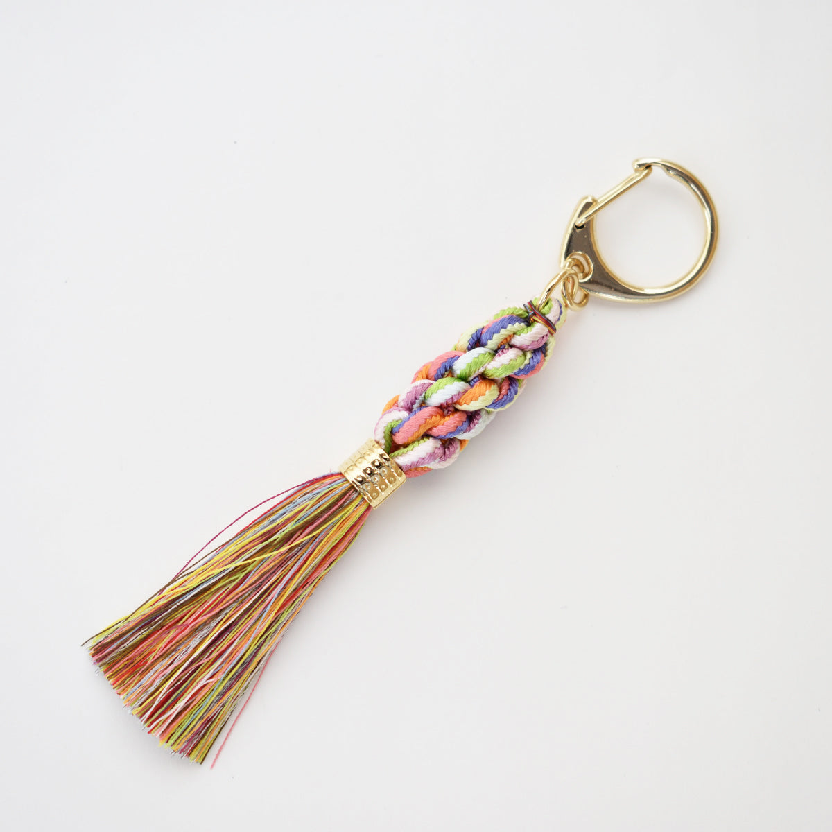 2本の組紐を「四つだたみ」という結びで丸みのある独特のフォルムに仕上げました。絹ならではの美しさを纏った色鮮やかなチャームは、付けるだけで華やかな雰囲気になります。鍵やバッグなど身近な物に付けてお楽しみいただけます。また静電気を逃がす特殊な糸を房に混ぜ込んでおり、房を握ることで静電気の発生を抑えることができます。