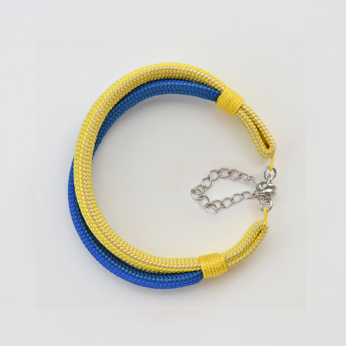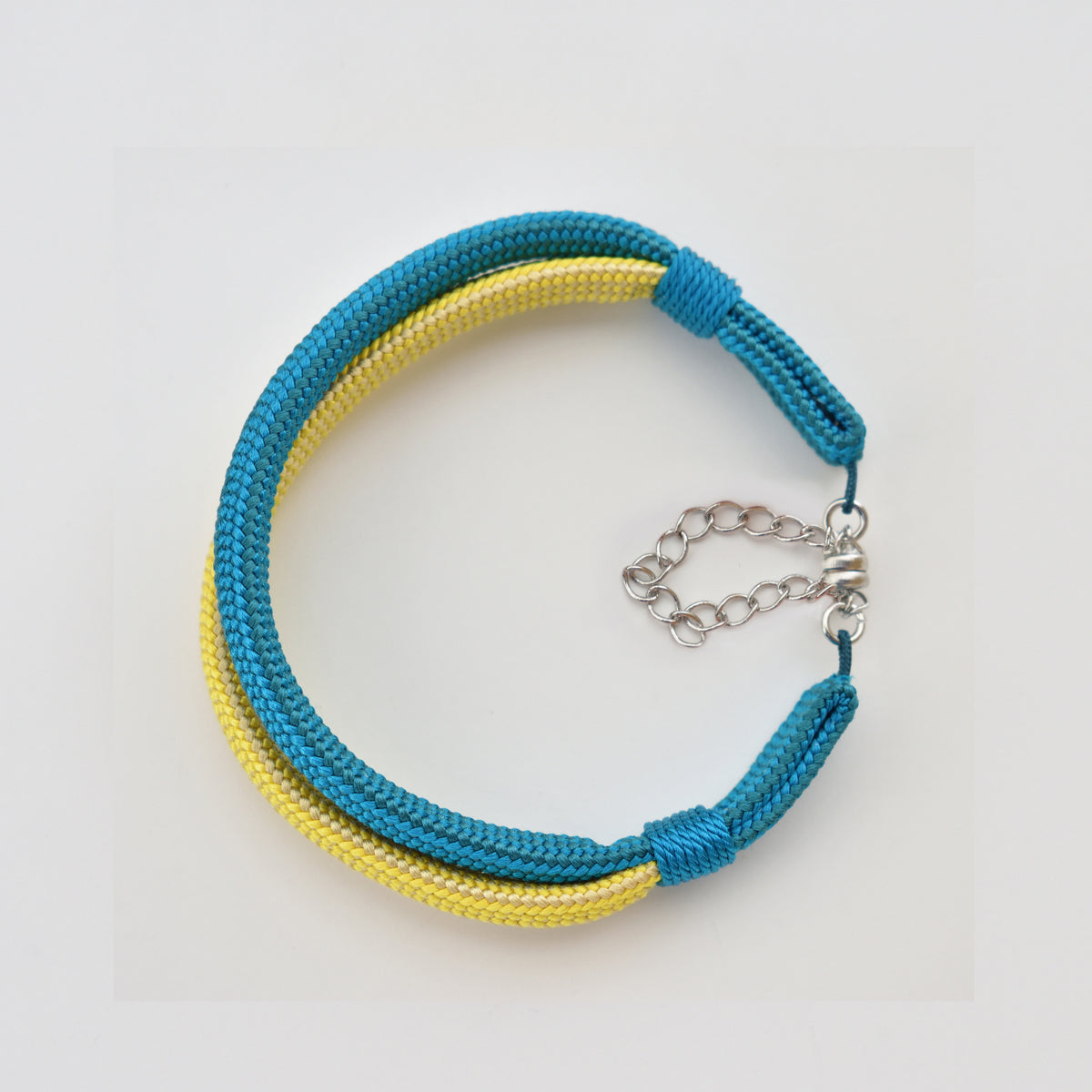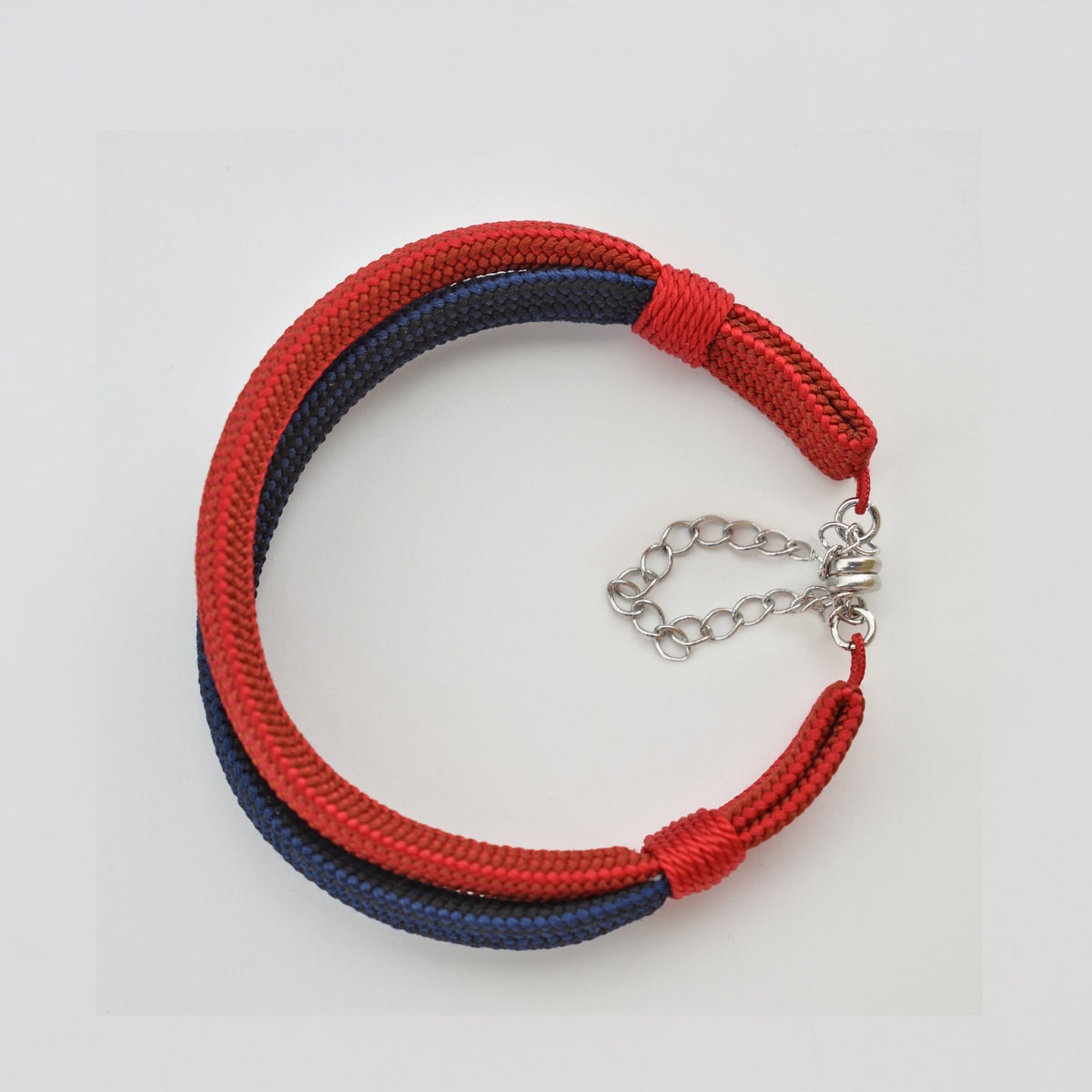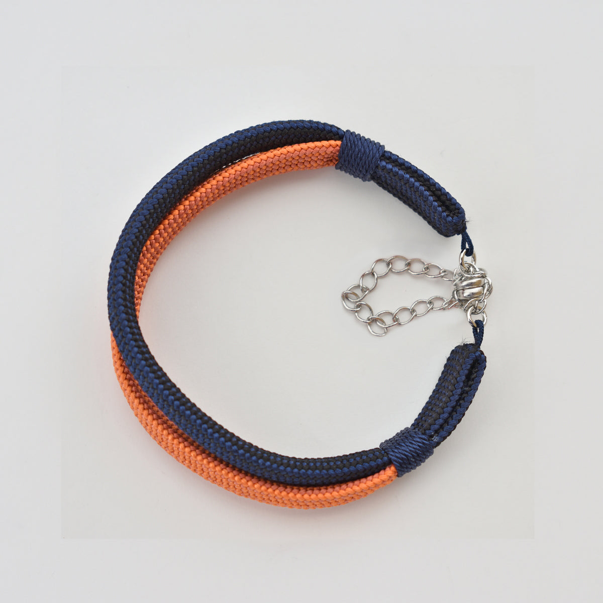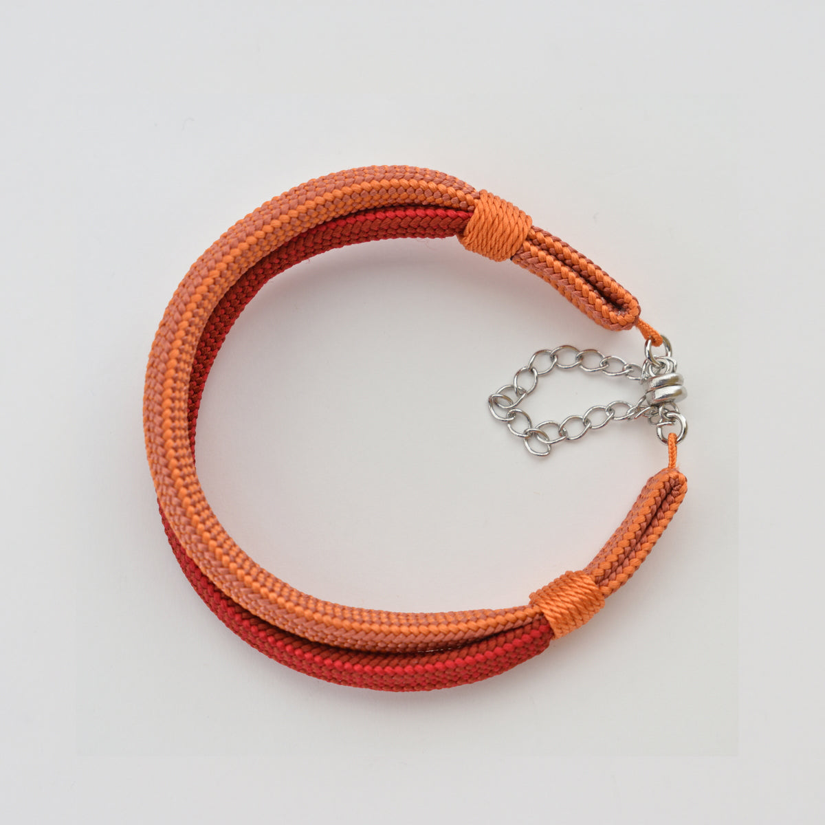 和装の三分紐にも使用される平組の紐をカラフルな色合いでブレスレットに仕たてました。丸みを出すために紐の中にあとから別の紐を差し込んでおり、ひとつひとつ丁寧に職人が手作りしています。ブレスレットの留め具には着脱のしやすいマグネットを採用しました。マグネットパーツは落下が心配…と言う方にも安心してご使用いただけるよう、落下防止のチェーンを取り付けています。カジュアルだけでなく和装との相性も抜群です。