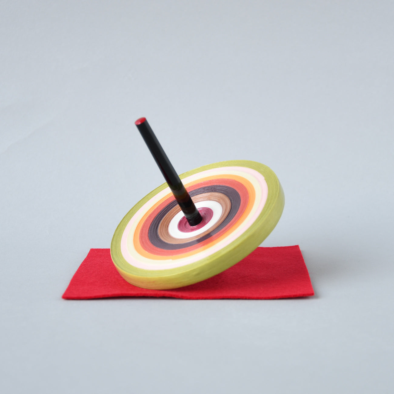 京こまは布製のお部屋の中で遊ぶ独特の独楽です。古くからの遊び道具である独楽は末広がりの形や輪の広がる独特の柄から繁栄繁盛を表し、物事がうまく回っていくようにと願われる縁起物としても、お正月に好んで遊ばれているものです。