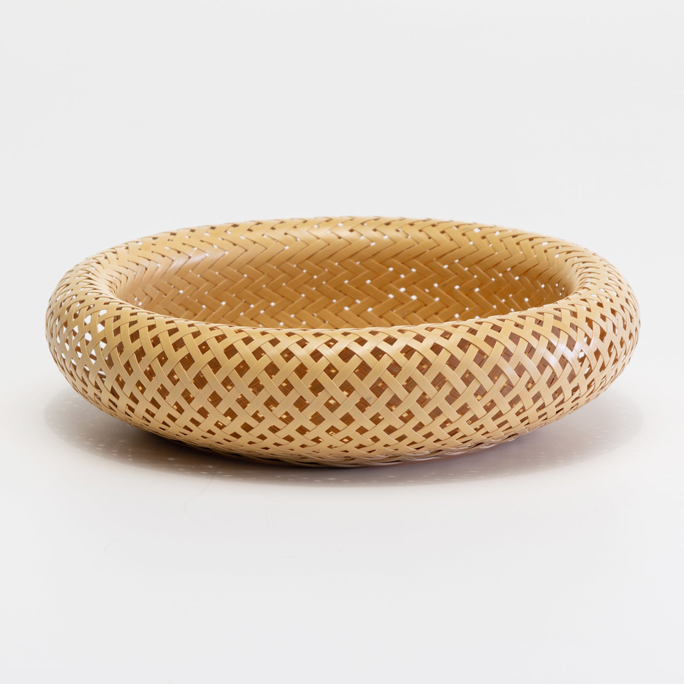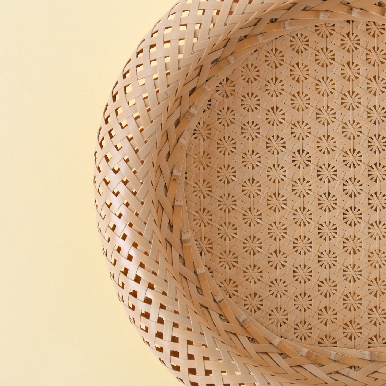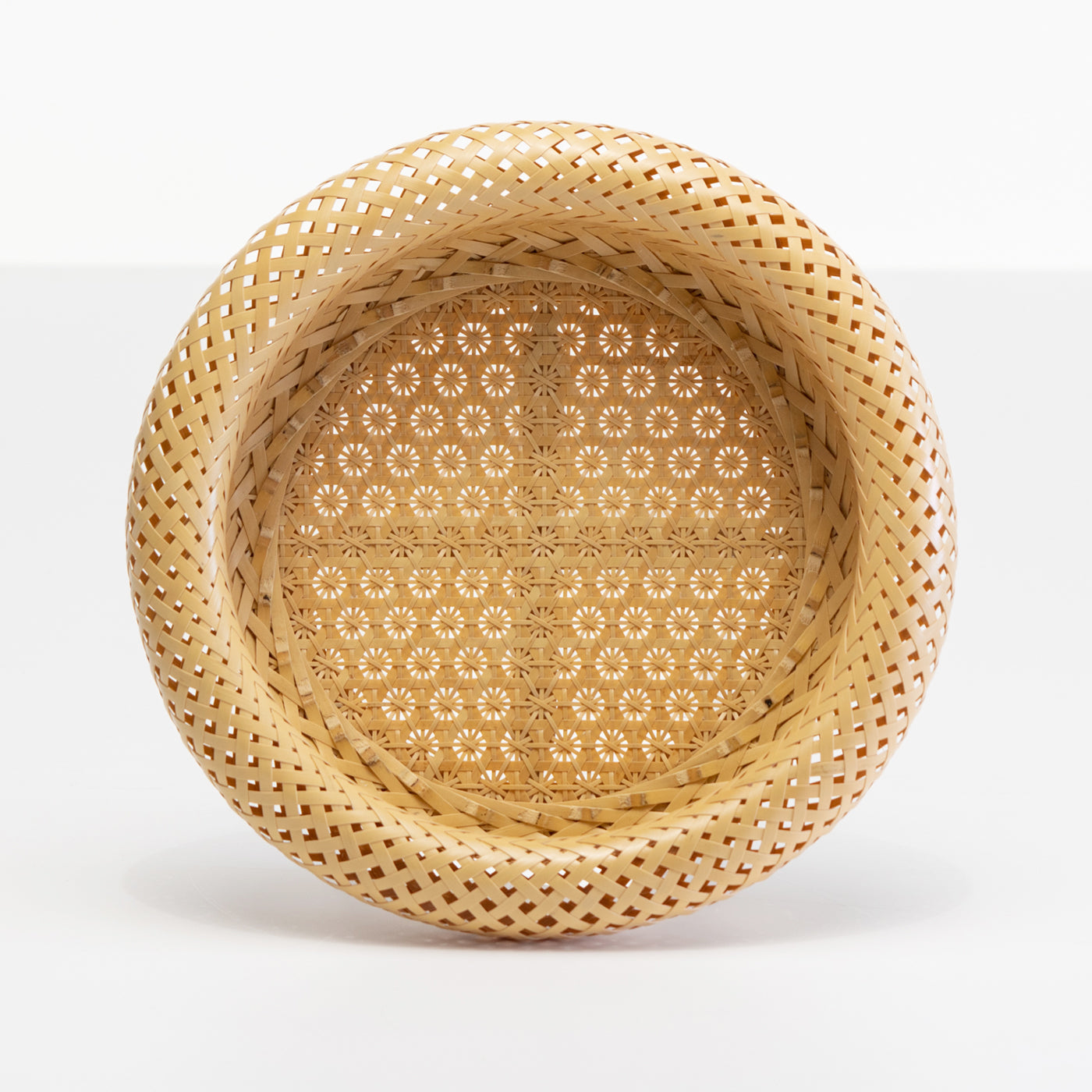 この底編は花六つ目編と呼ばれ、小花柄に見えるところがポイントです。ていねいに編み込まれた繊細な編み目は、可憐でエレガント。側面はドーナツ状のゆるやかなカーブをえがいており、竹を素材としながらもなめらかで、手を傷つけることもありません。
