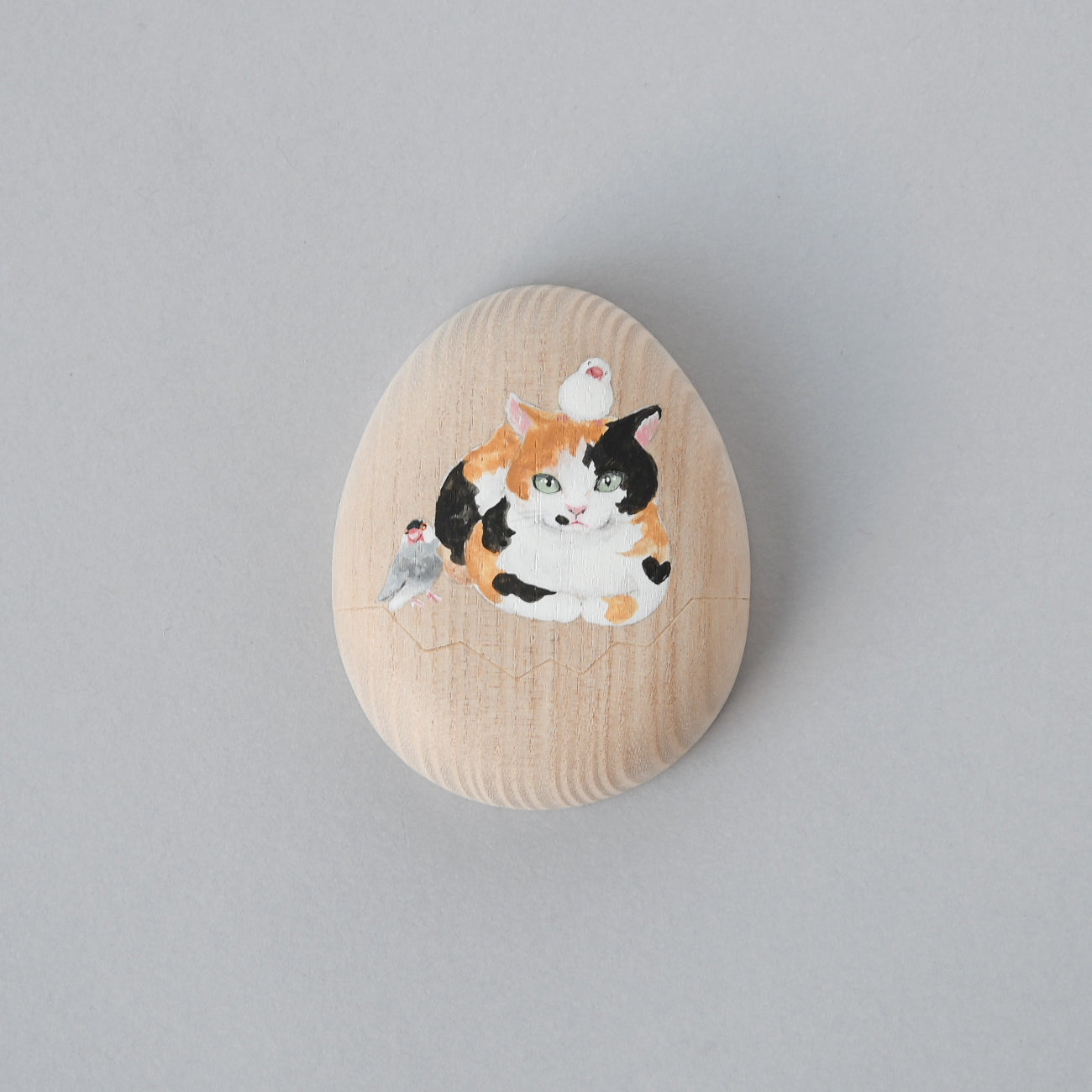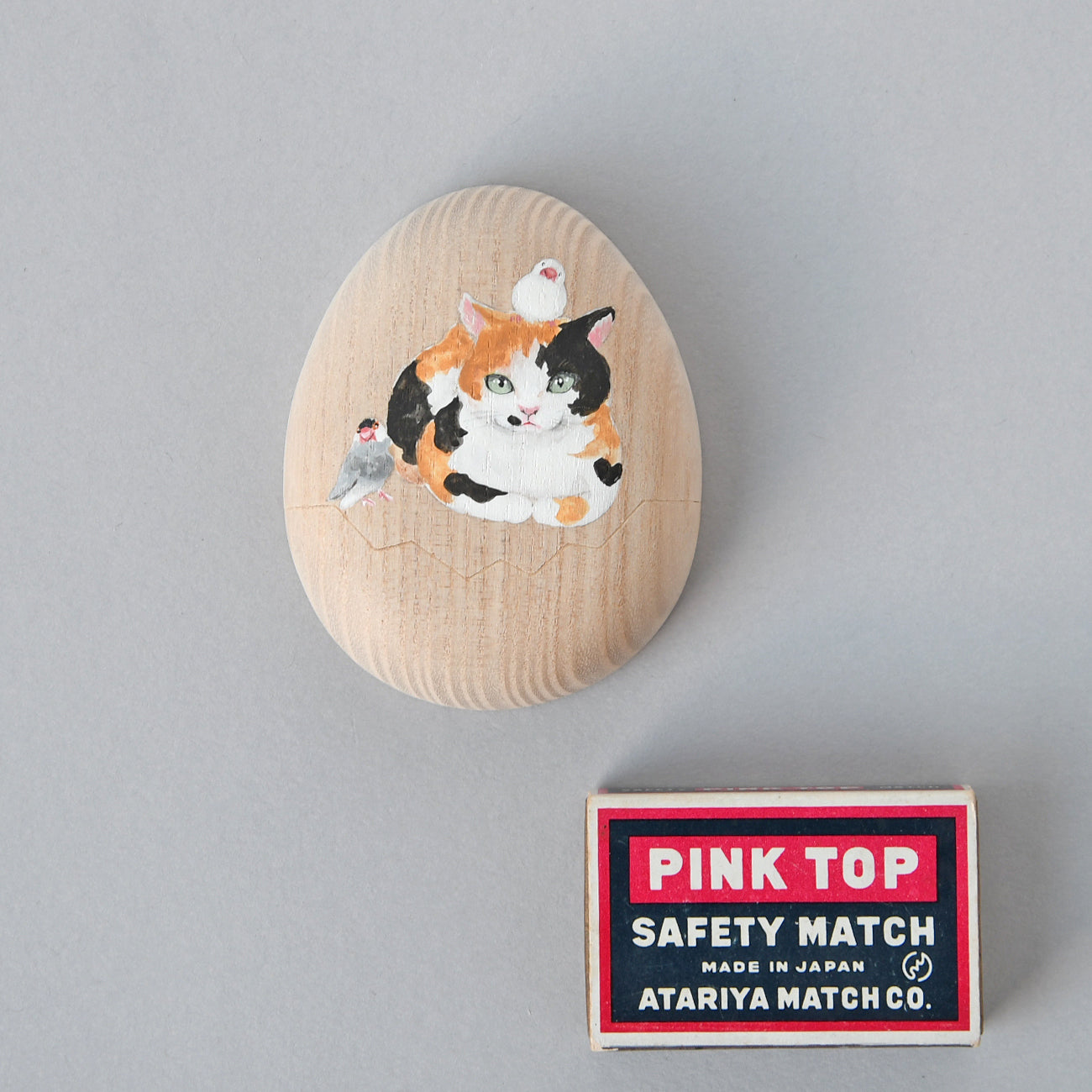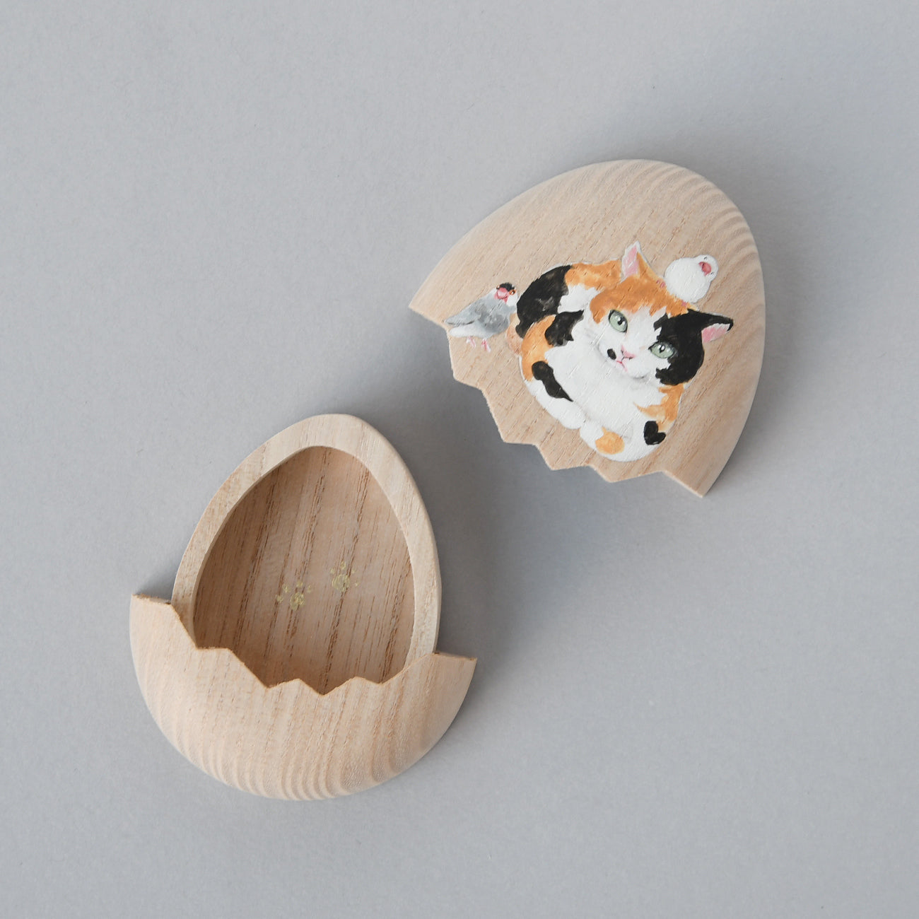 たまご箱の可愛らしいフォルムが特徴の桐箱です。開閉はスライド式。開け口がギザギザなのも人気のひとつ。開けると表の絵に因んだ絵柄が顔を覗かせます。