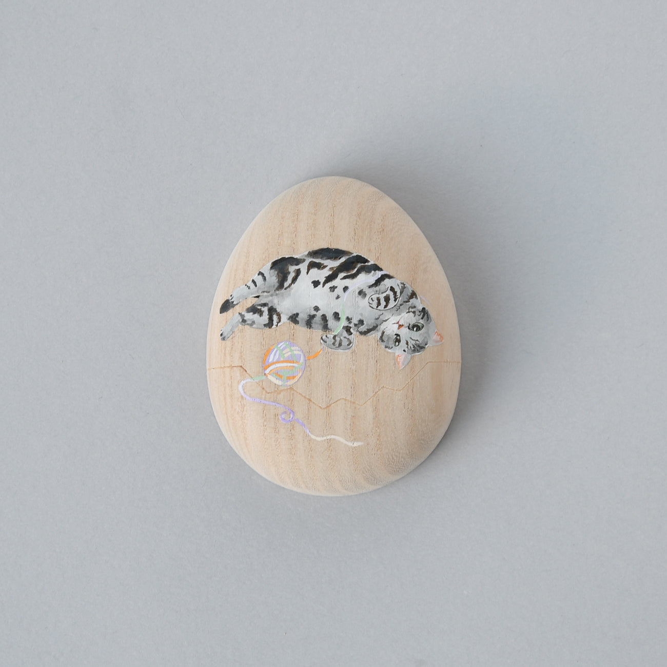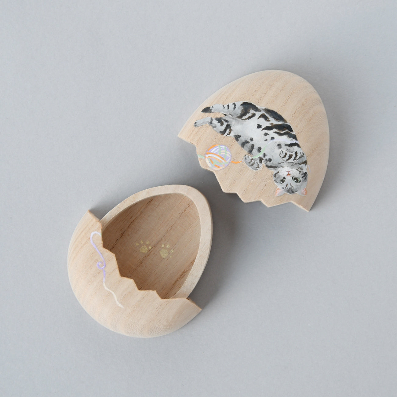 たまご箱の可愛らしいフォルムが特徴の桐箱です。開閉はスライド式。開け口がギザギザなのも人気のひとつ。開けると表の絵に因んだ絵柄が顔を覗かせます。