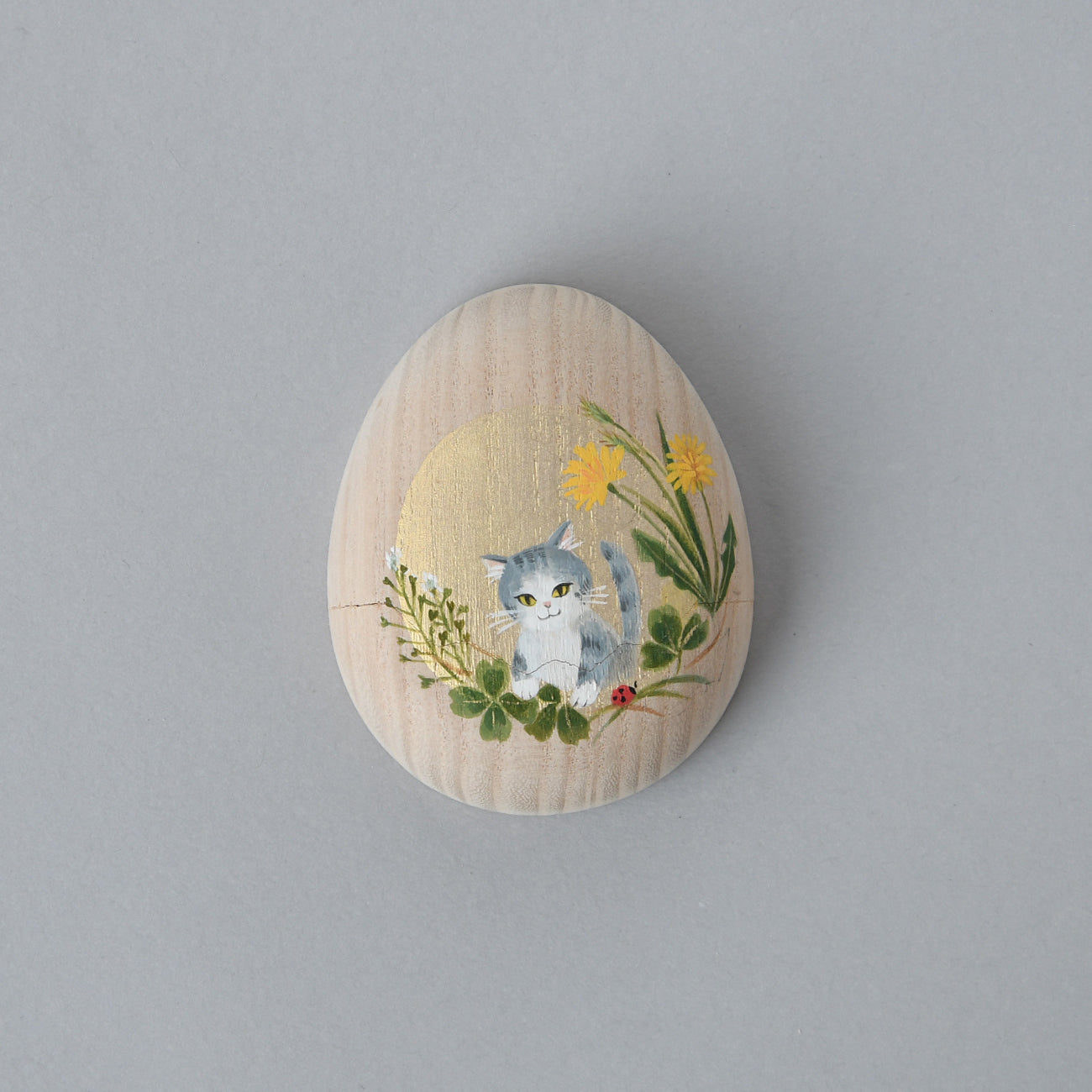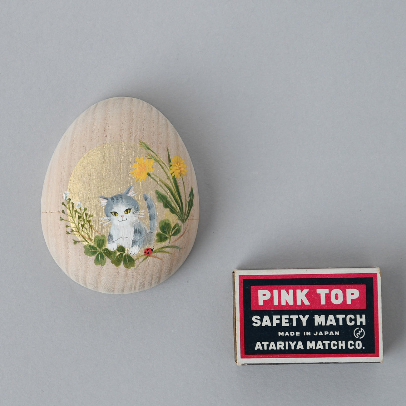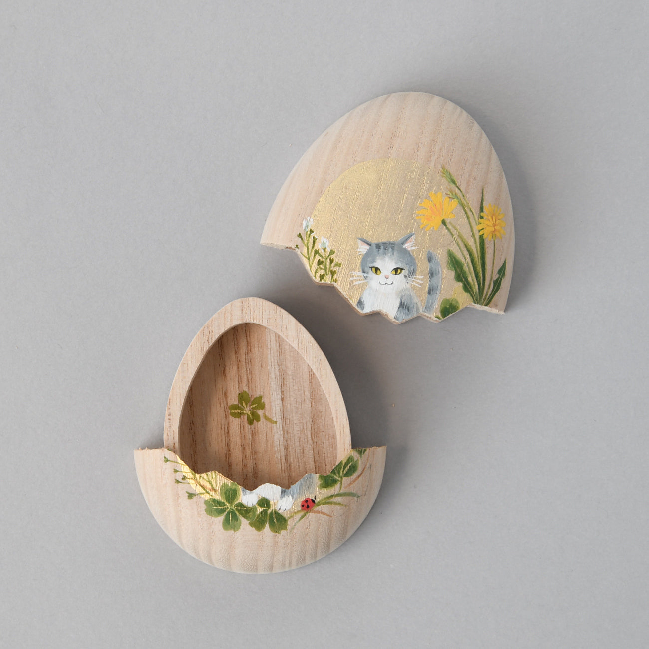 たまご箱の可愛らしいフォルムが特徴の桐箱です。開閉はスライド式。開け口がギザギザなのも人気のひとつ。開けると表の絵に因んだ絵柄が顔を覗かせます。