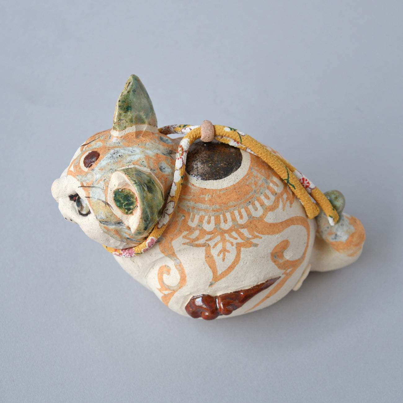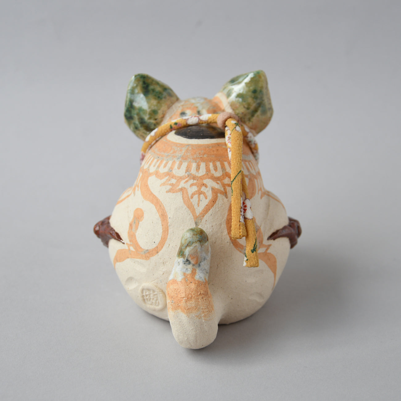 背中には神社仏閣の装飾や西陣織からインスパイアを受けた模様が、釉薬で思いつくまま描かれています。