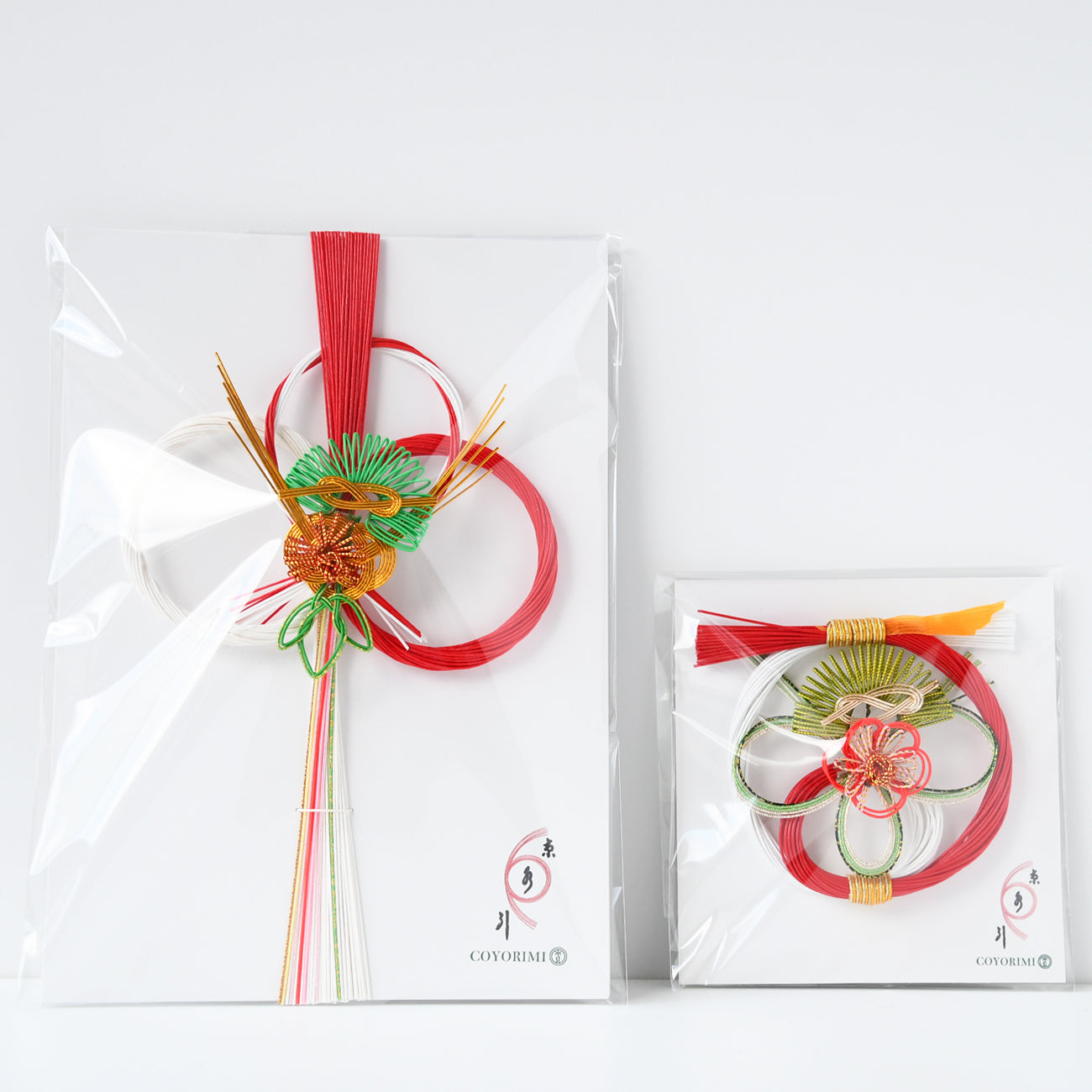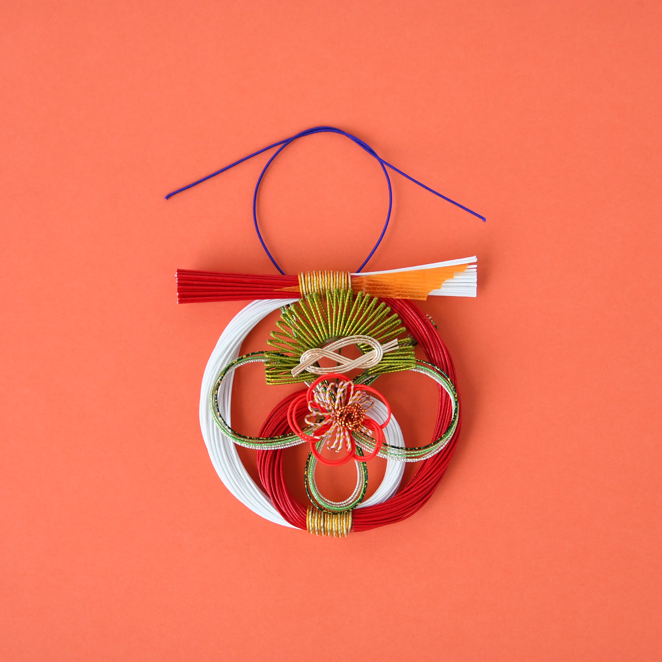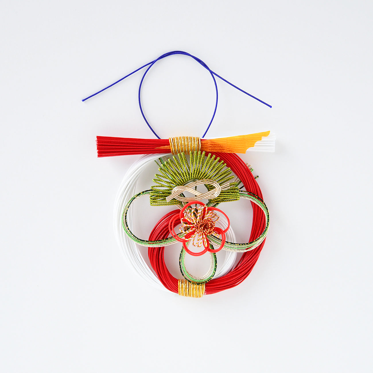 水引は細長く裁断した和紙に強く撚りをかけ、水の中で引き、さらに様々な加工を経て仕上げられています。その水引の美しい彩りを結び、中央に松竹梅を配しました。