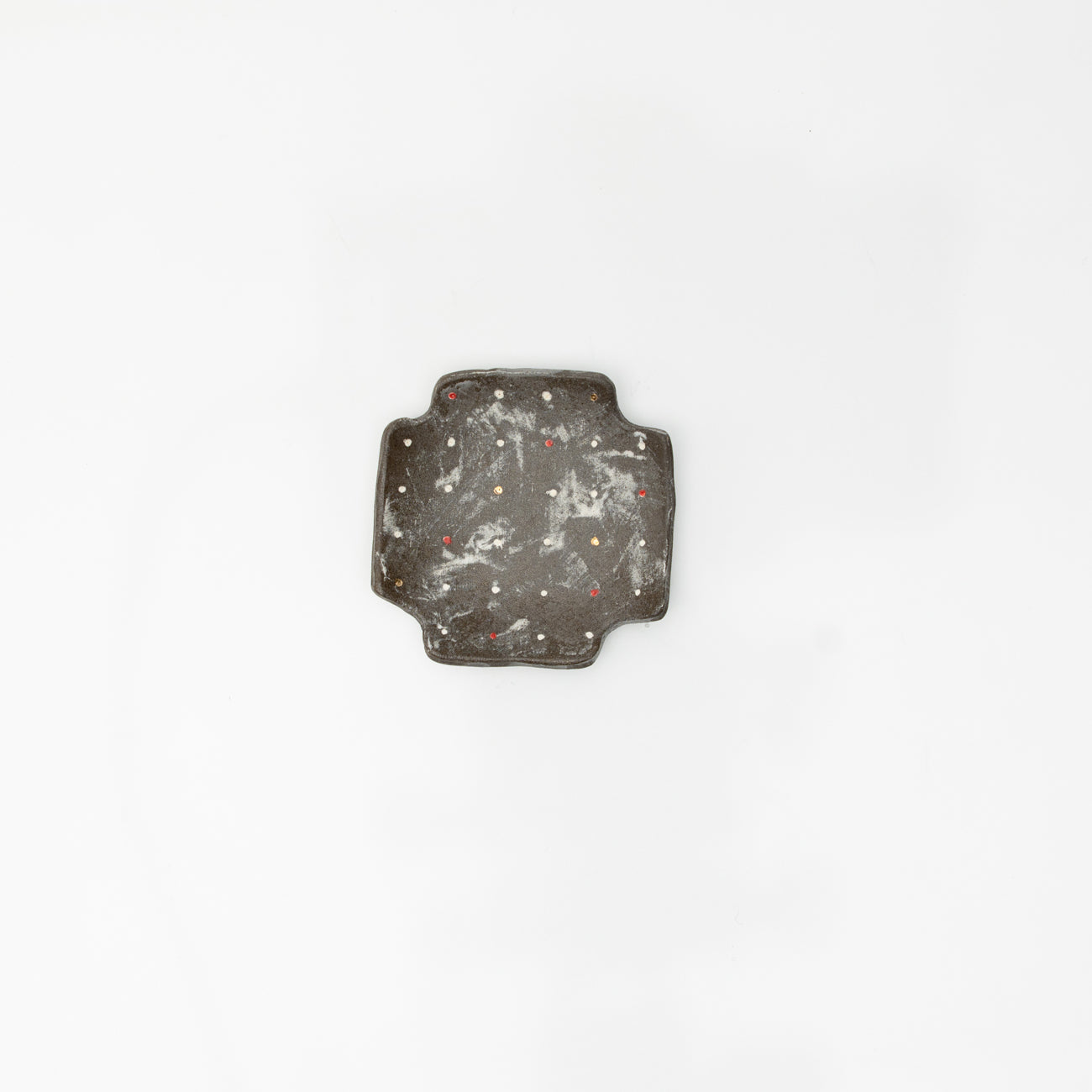 黒土に相対する白化粧(+透明釉)を使って、小さなドット模様が規則正しく並んでいるようですが、ところどころに赤と金のドットが配されているのがアクセントになっています。