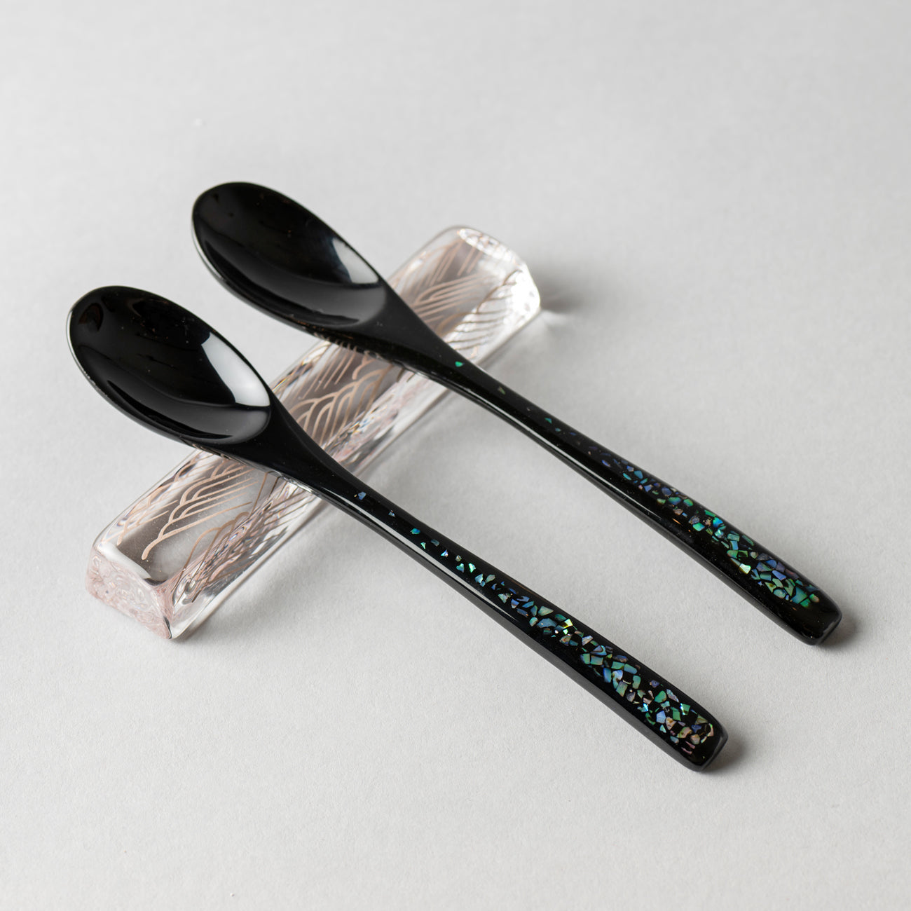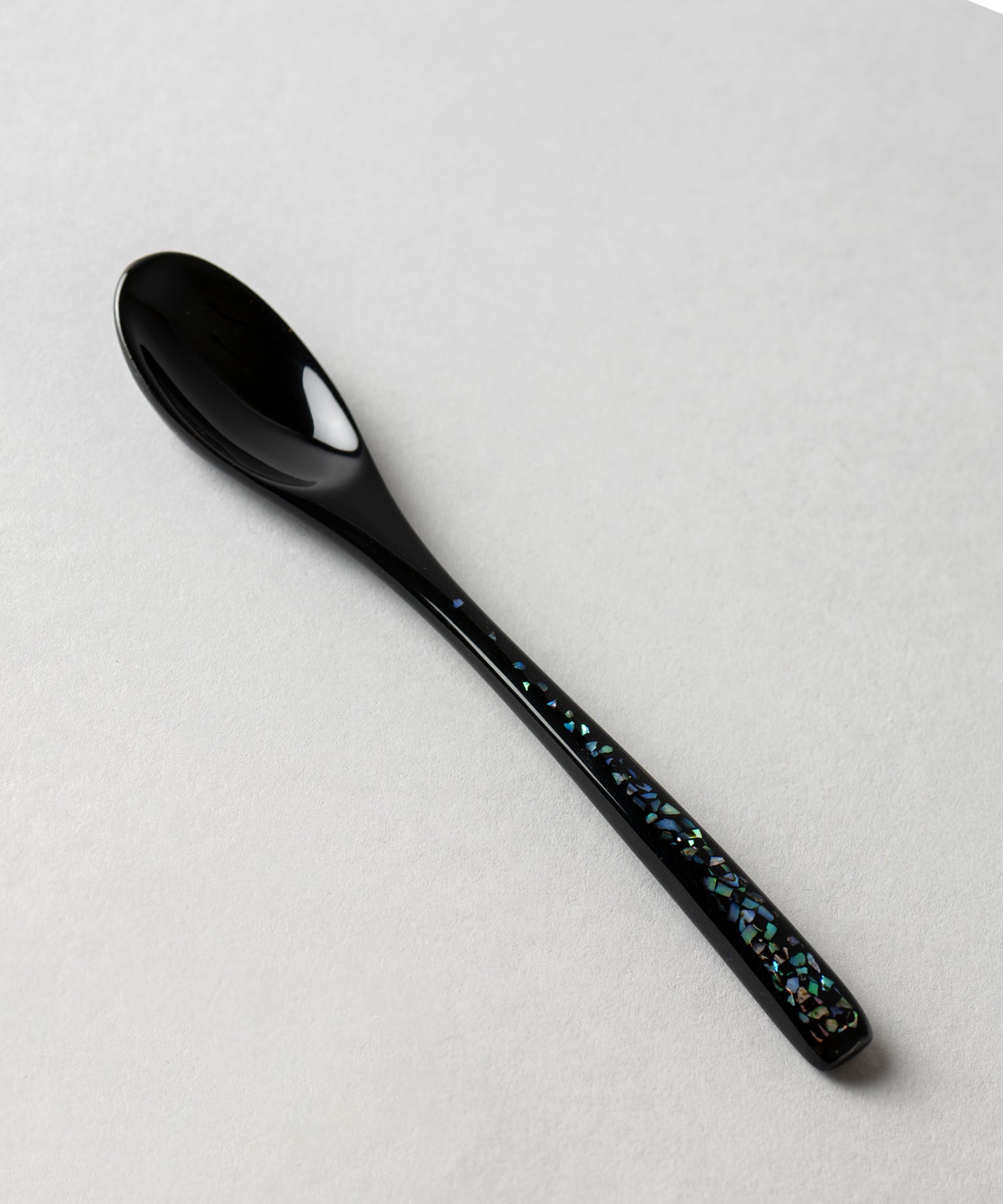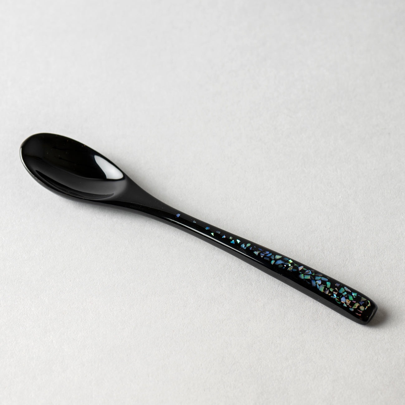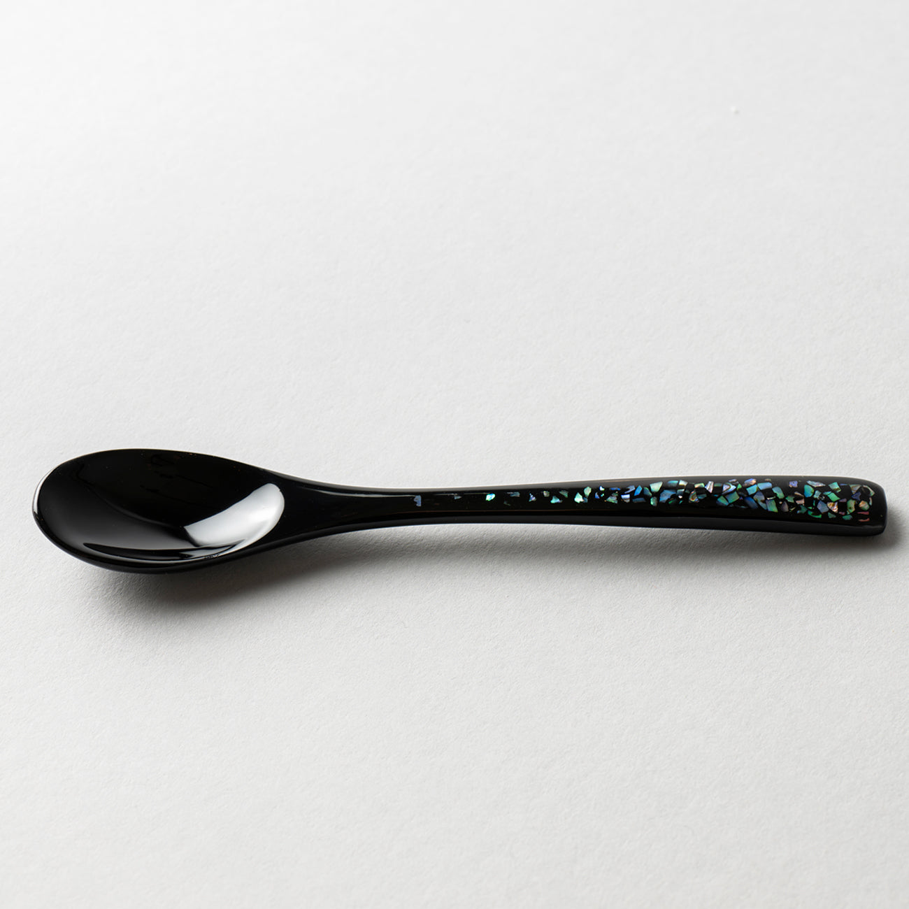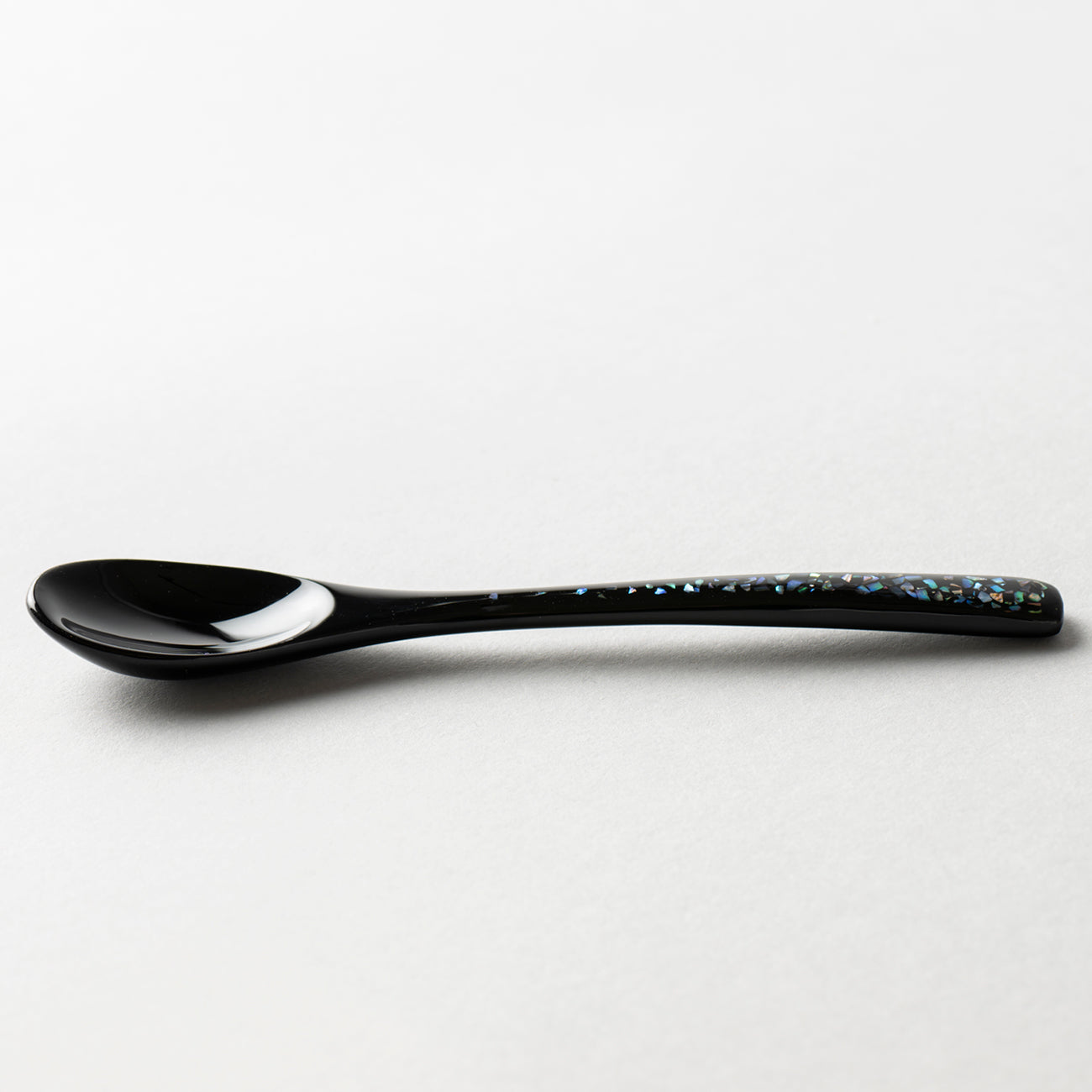 黒漆のスプーンにランダムに螺鈿が散りばめられています。