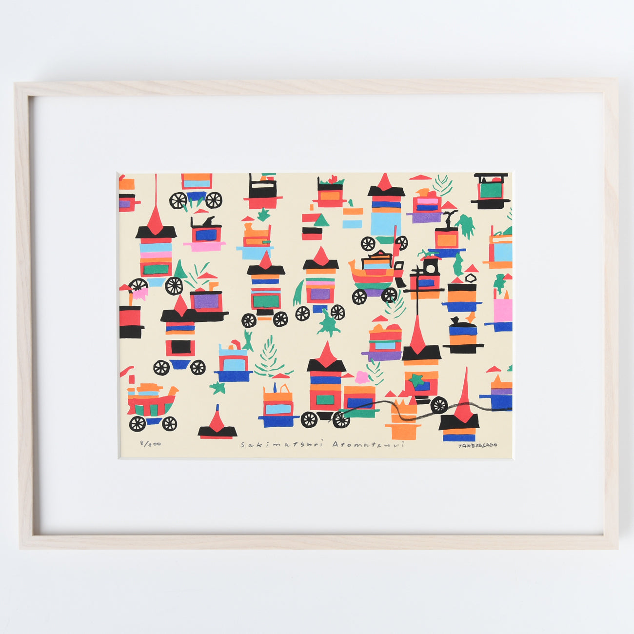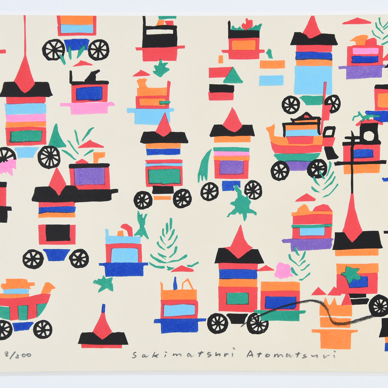 京都の夏の風物詩である「祇園祭」。前祭(さきまつり)、後祭(あとまつり)でズラリと立ち並ぶ壮観な鉾。手描きの線の面白さをそのまま木版画に生かし、お祭りの賑やかな雰囲気を遊び心で表現。