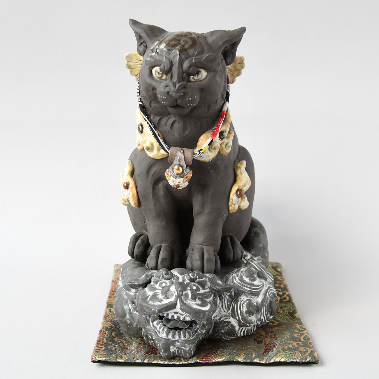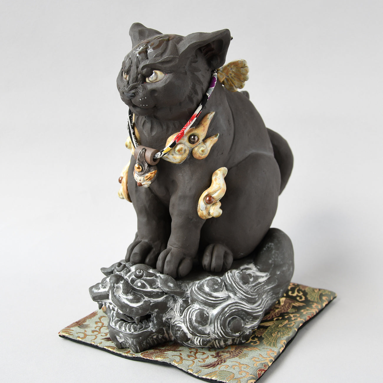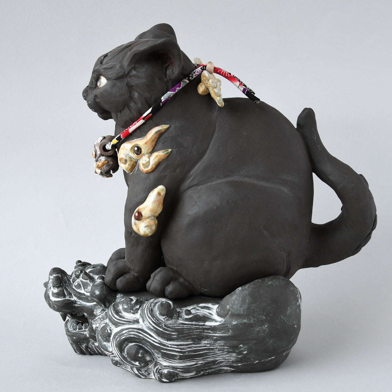 神格化された動物は身体に雲龍模様をまとっています。この猫も、黒土を使い、焼締めで仕上げ、身体に雲龍模様が施されています。