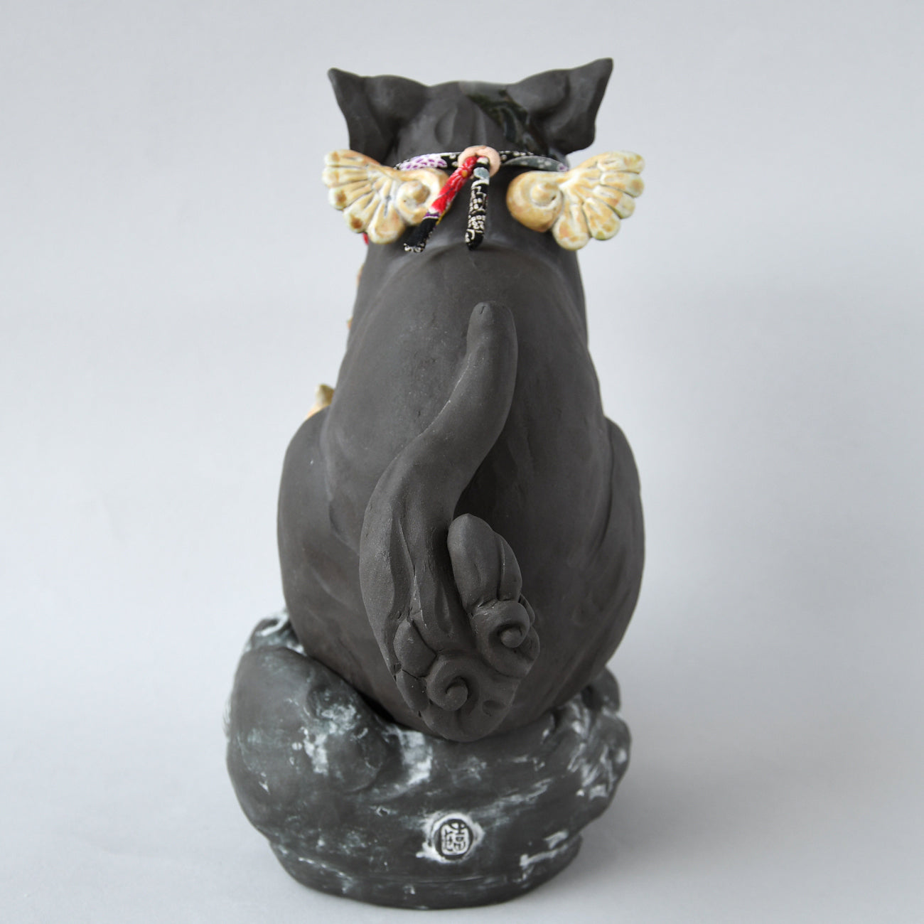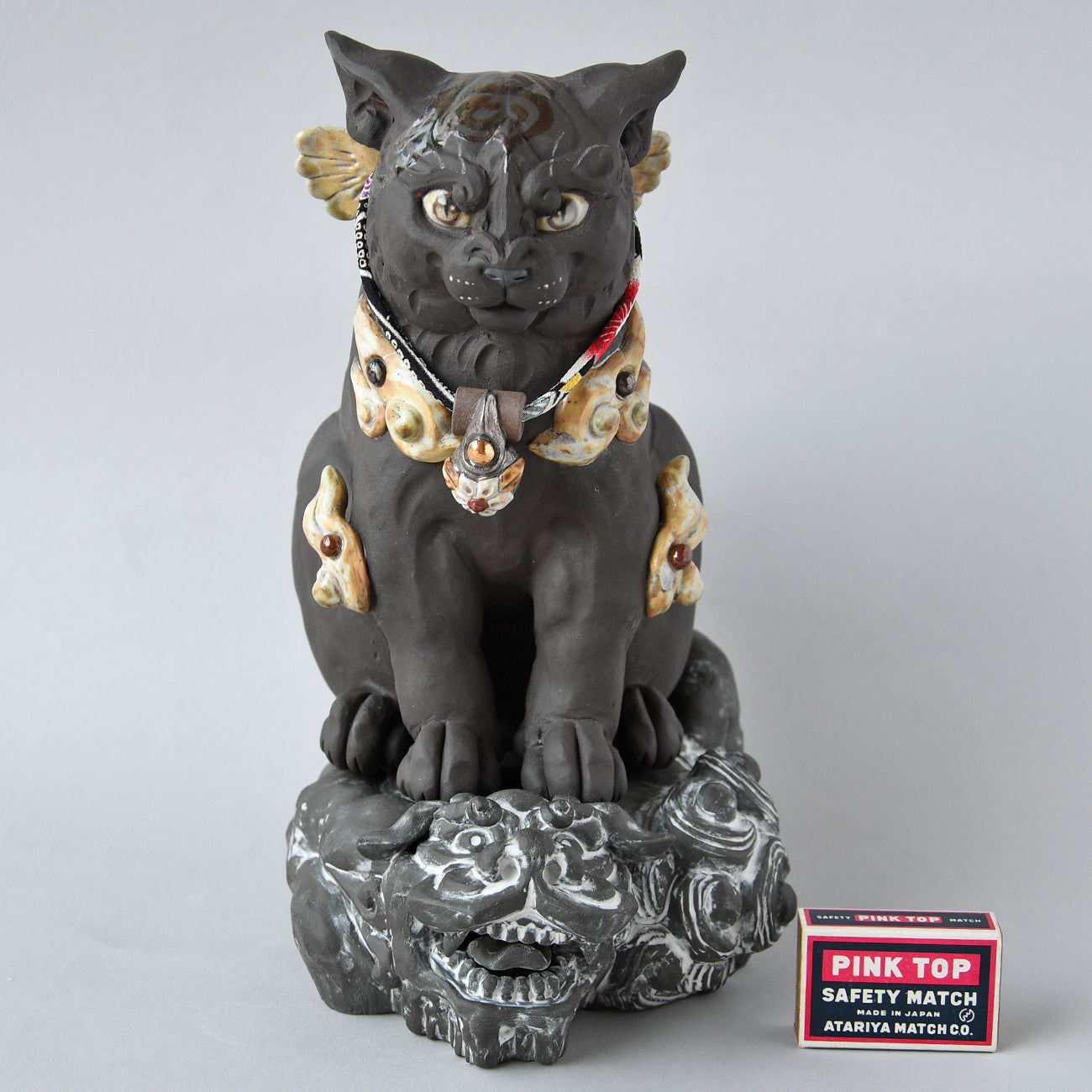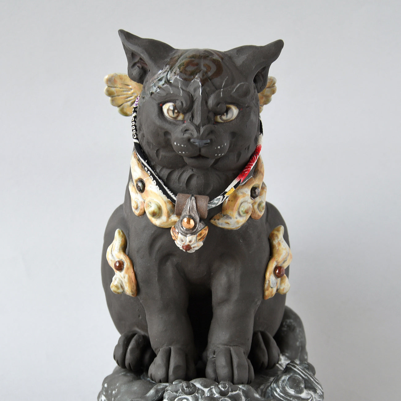 神格化された動物は身体に雲龍模様をまとっています。この猫も、黒土を使い、焼締めで仕上げ、身体に雲龍模様が施されています。