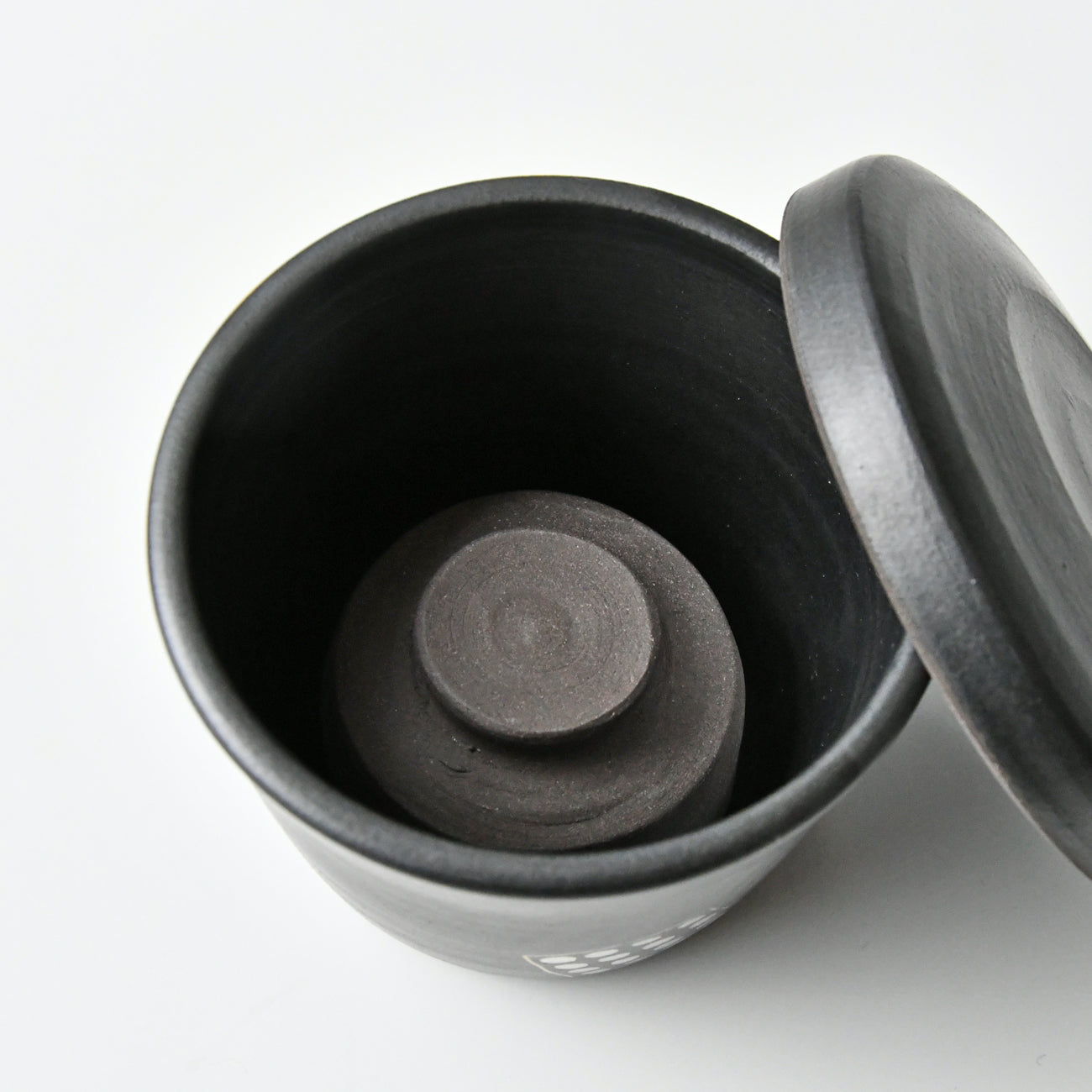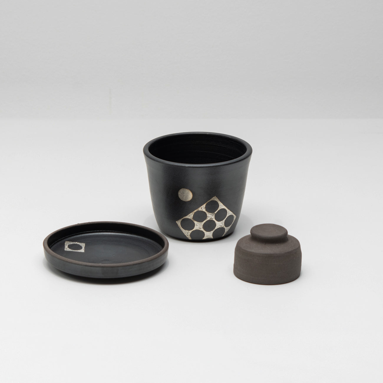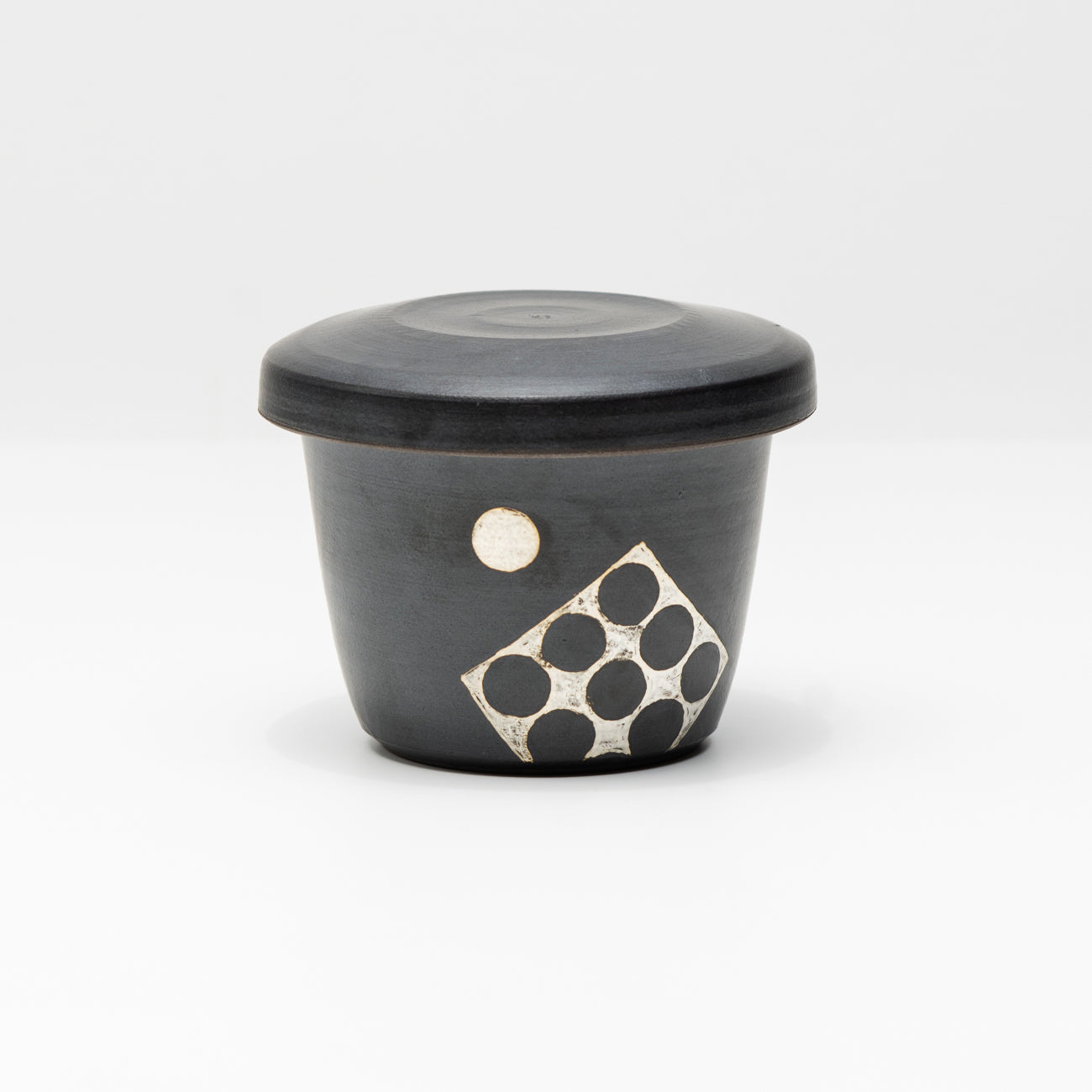 黒釉は表面に小さなシボと光沢があるとても美しい黒釉です。シンプルなフォルムに銀彩で描かれたポップな文様は、そのまま食卓に出しても素敵です。また、蓋付きなので、冷蔵庫にもそのまま仕まうこうともできます。