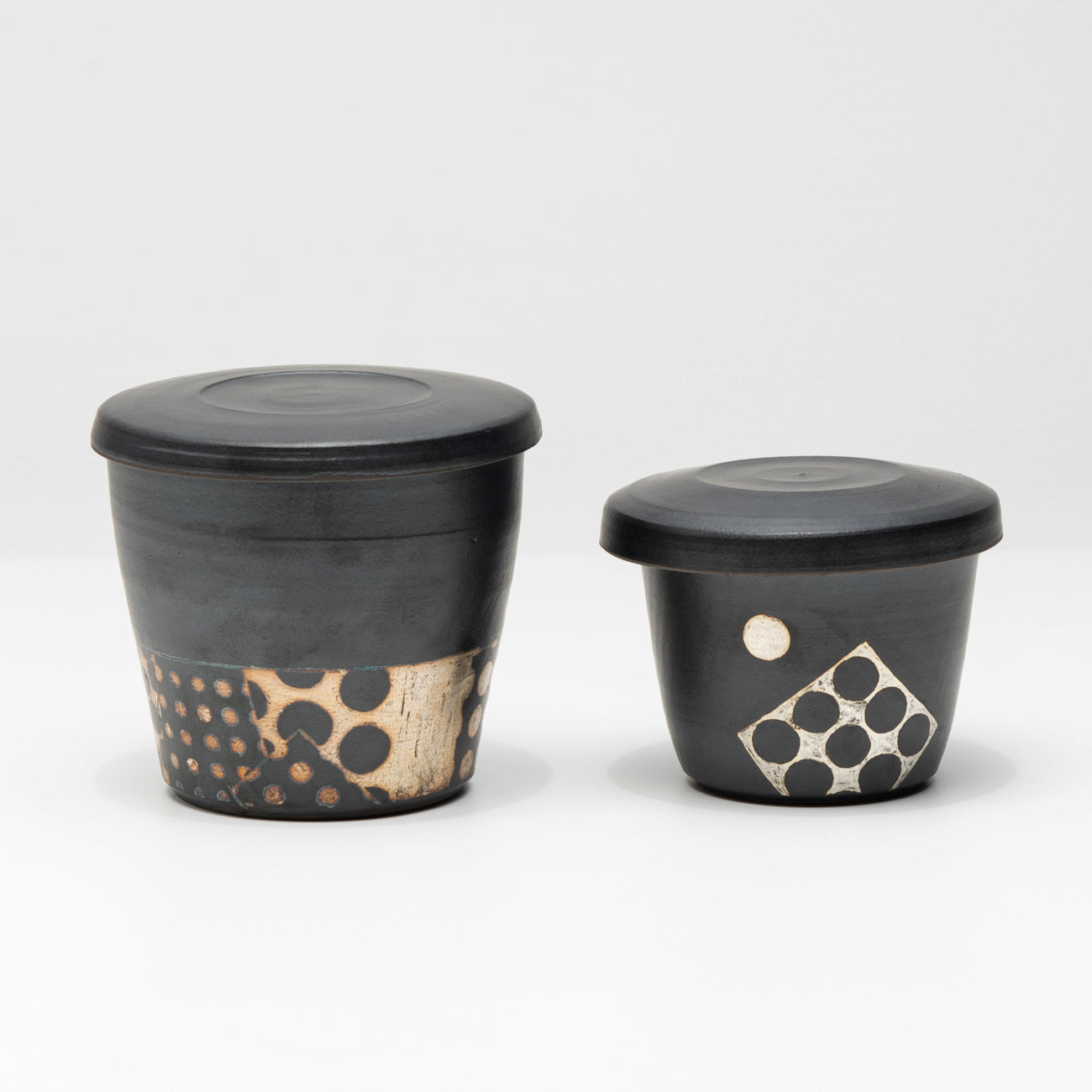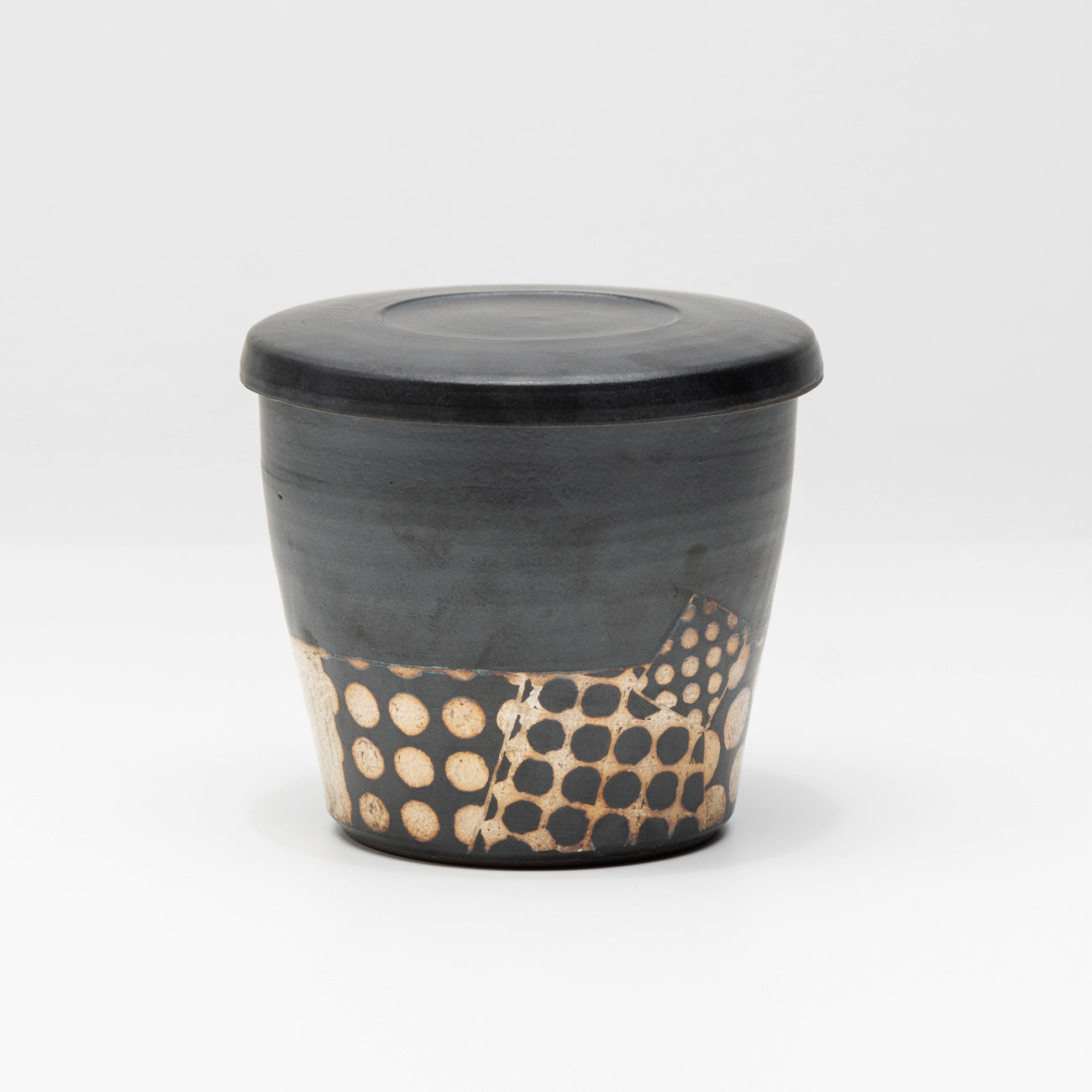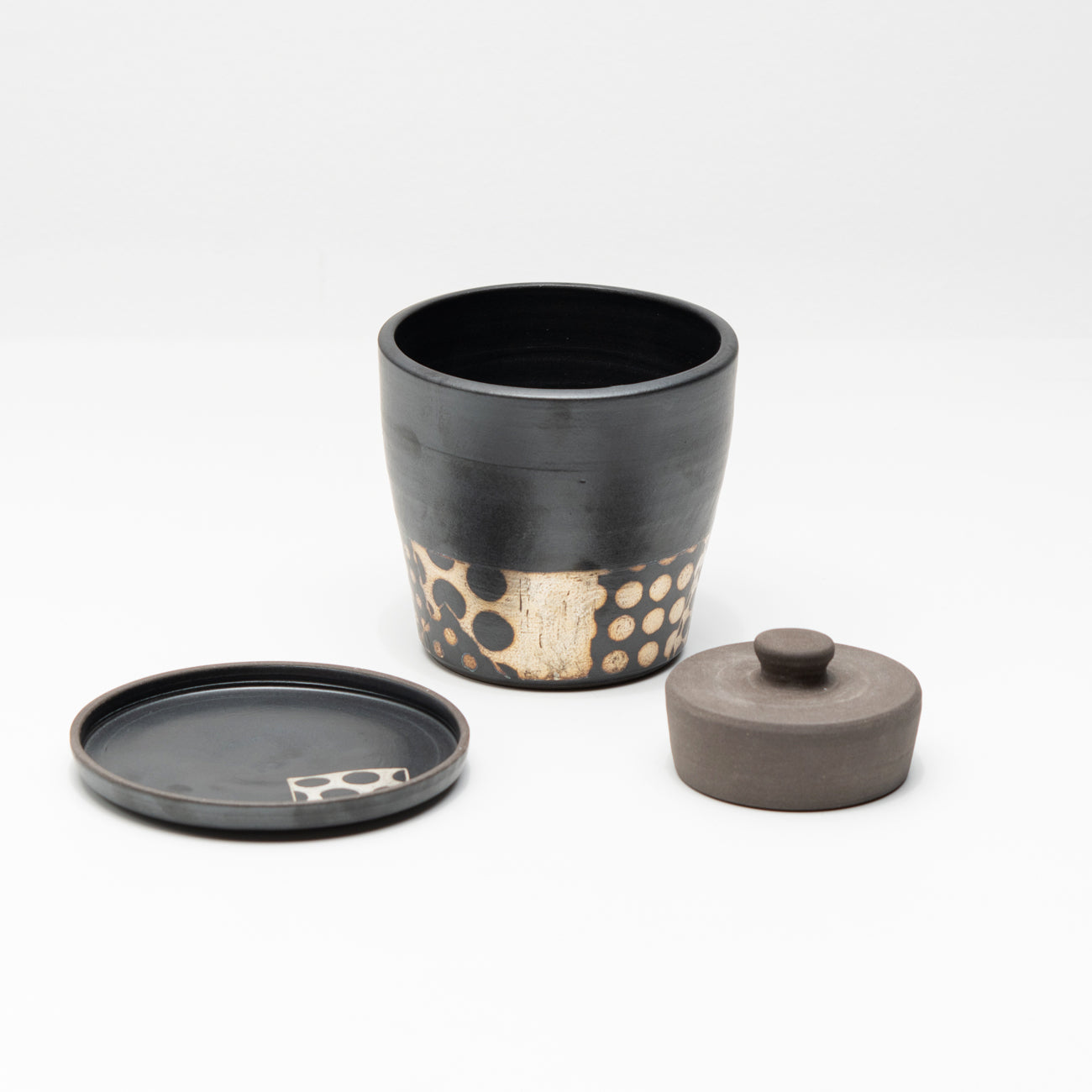 黒釉は表面に小さなシボと光沢があるとても美しい黒釉です。シンプルなフォルムに銀彩で描かれたポップな文様は、そのまま食卓に出しても素敵です。また、蓋付きなので、冷蔵庫にもそのまま仕まうこうともできます。