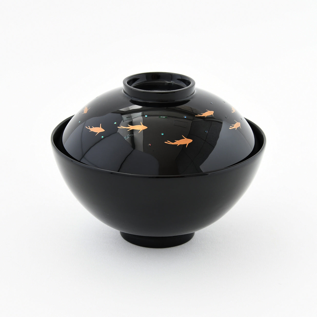 金粉と青貝で鮎と水面が描かれています。