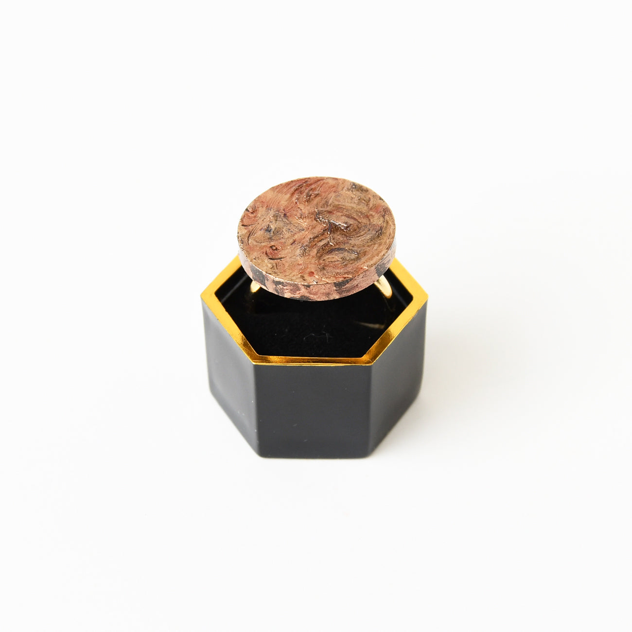 …彩雲とは太陽の近くにかかった雲が赤、黄、緑などの色に分かれて虹色に見える現象のことで、それを漆作品に落とし込んだ漆蒔絵リングです。見る角度によって輝く色味が異なるように仕上げています。技法の特性上絵柄のパターンが一つ一つ異なる仕上がりになります。