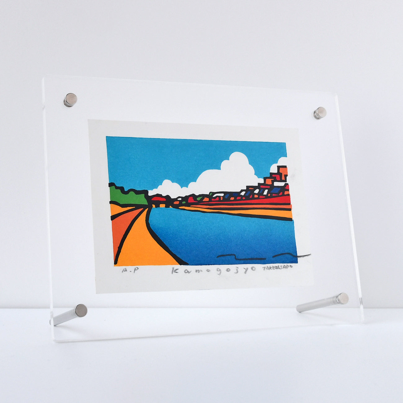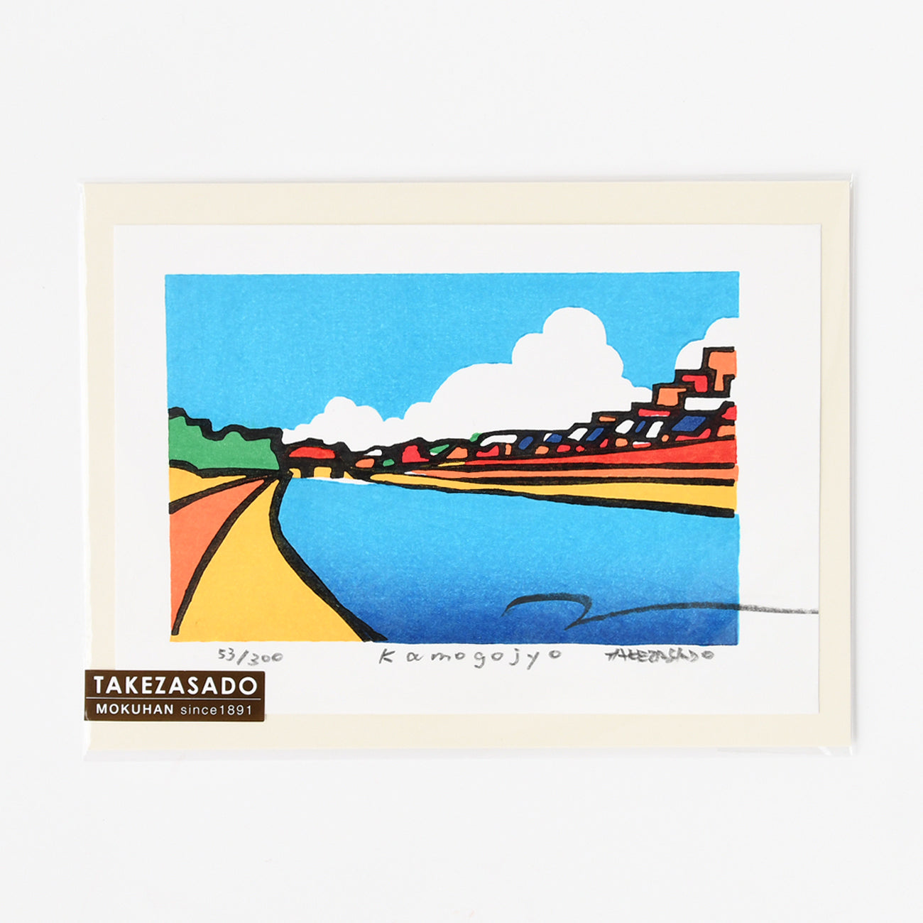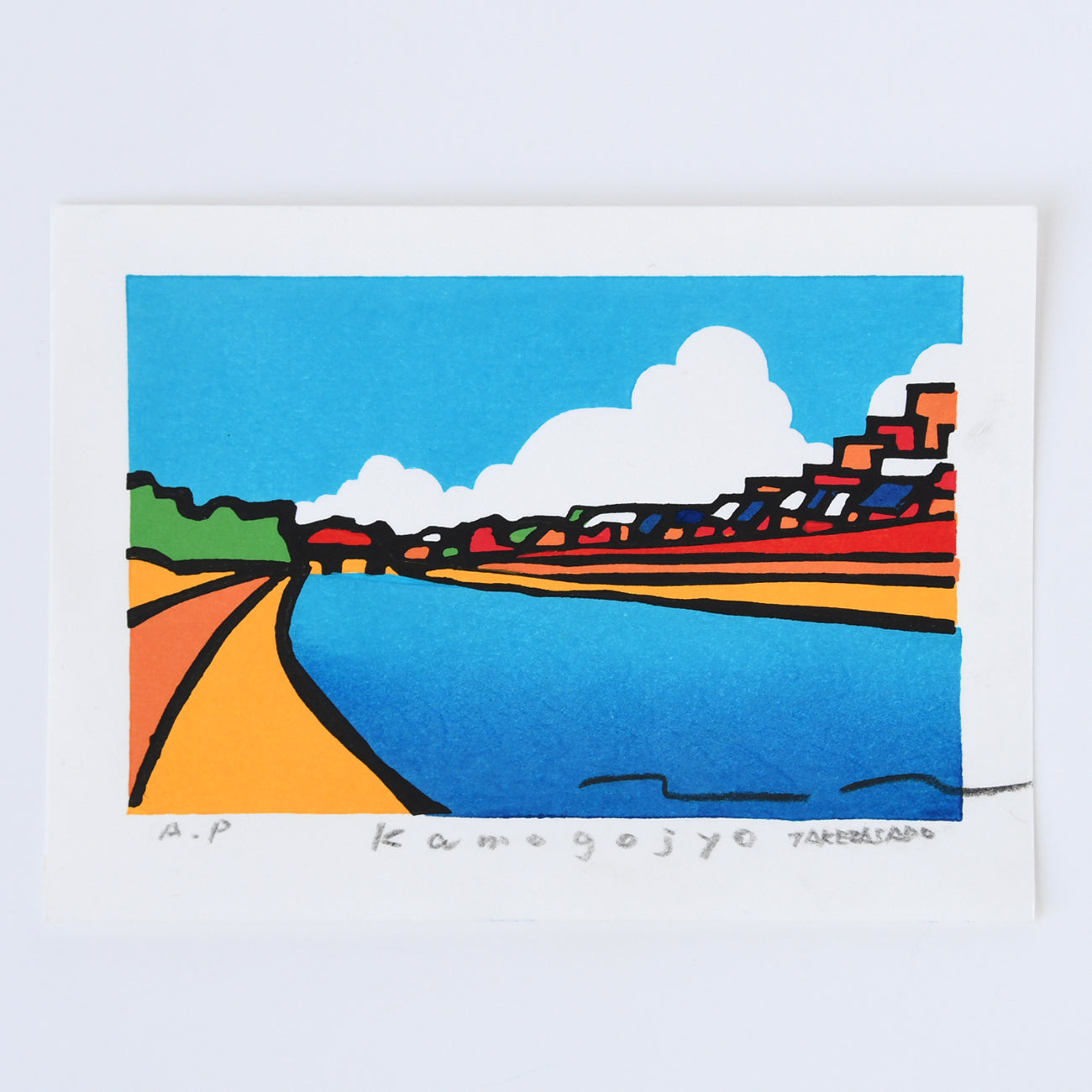 四条大橋から南へ向かうと鴨川の流れは、街並みや遊歩道と平行に緩やかなカーブを描きます。 晴れの日の明るい陽光を受けた川の風景を色彩豊かな配色で描かれています。