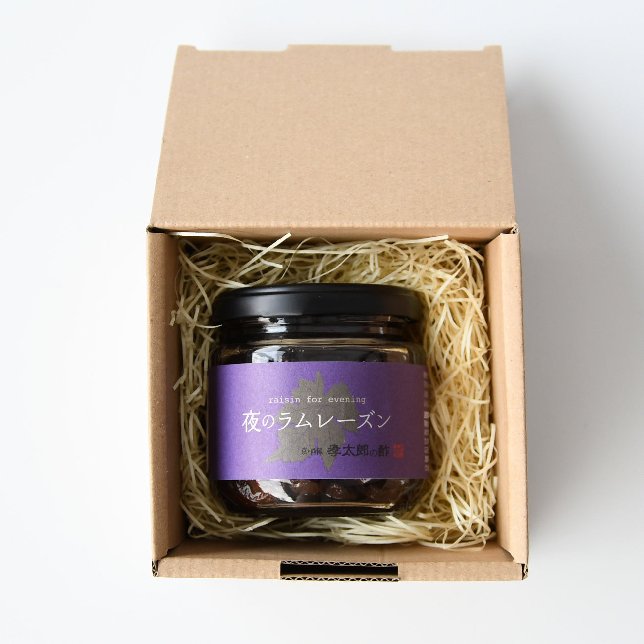 夜のラムレーズンは有機レーズンにこだわりの100%ブドウ果汁と孝太郎の米酢、和歌山県産南高梅から造った孝太郎の梅酢で甘酸っぱく仕上げ、更にこだわりの無添加・無着色の沖縄県産ラム酒で味付けした大人味。本来ラム酒には香料や着色料が多く使用されていますが、サトウキビから無添加で造られたラム酒には力強い香りと味わい。一味違うラムレーズンです。